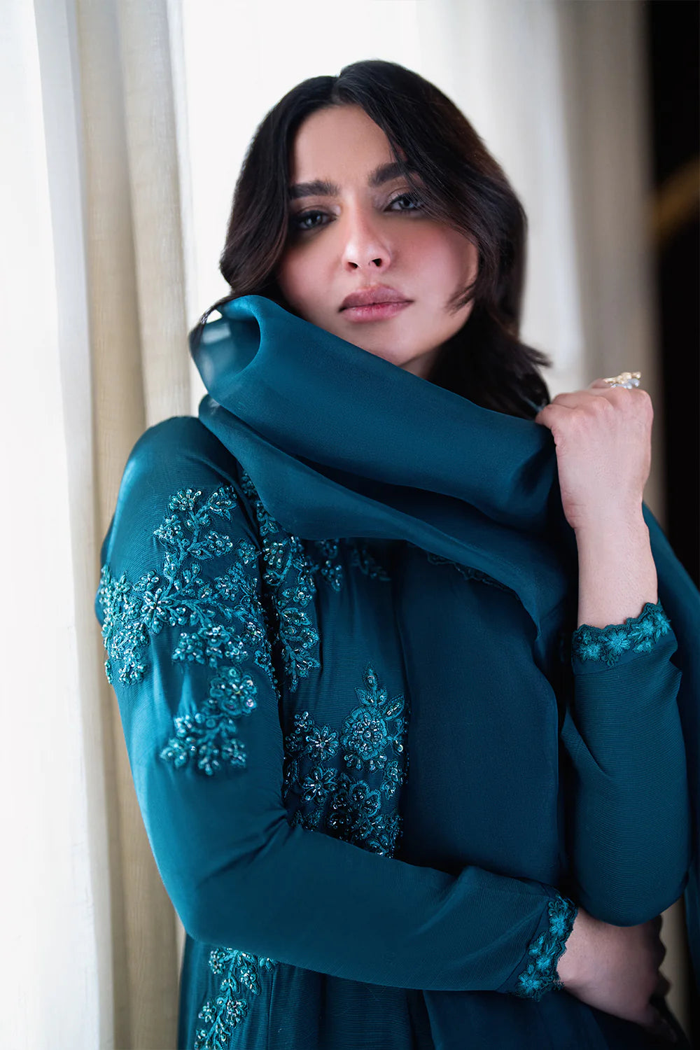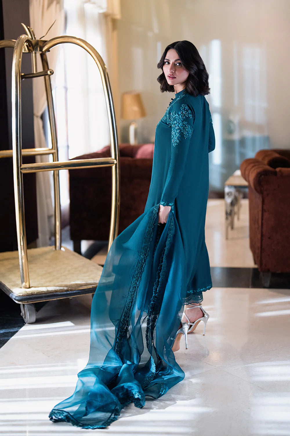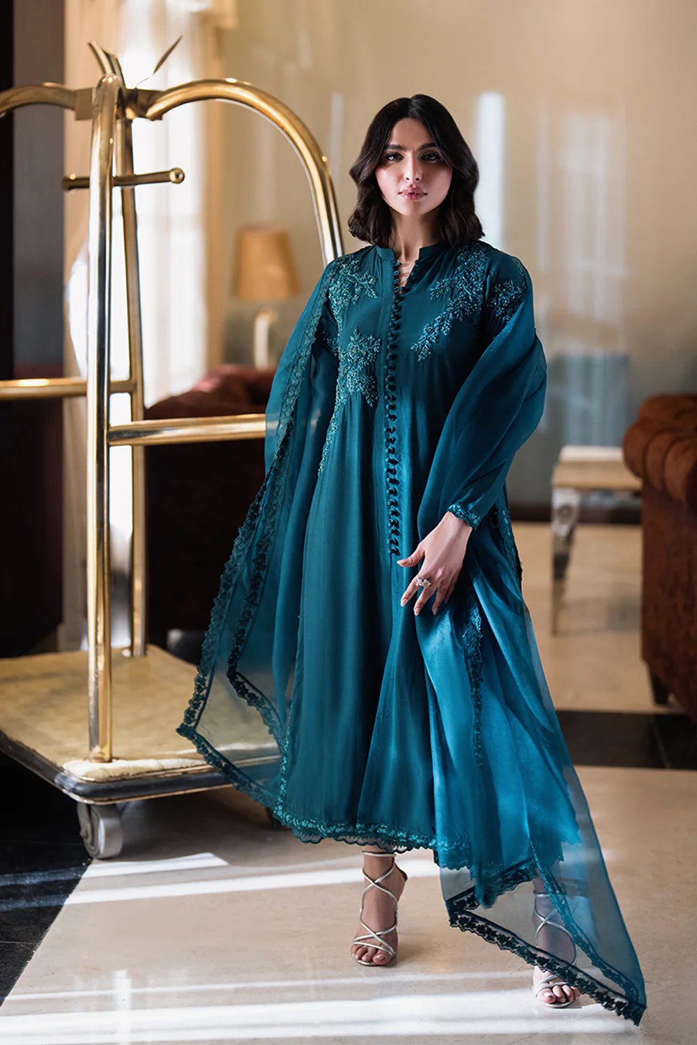 Introducing Cypress Mist – a stunning emerald green three-piece crafted from luxurious raw silk. The front and sleeves are adorned with delicate hand-embroidered bunches, adding a touch of intricate artistry to the design. Paired with flapper trousers and a pure organza dupatta, this Diva outfit combines timeless elegance with modern flair, perfect for making a sophisticated statement