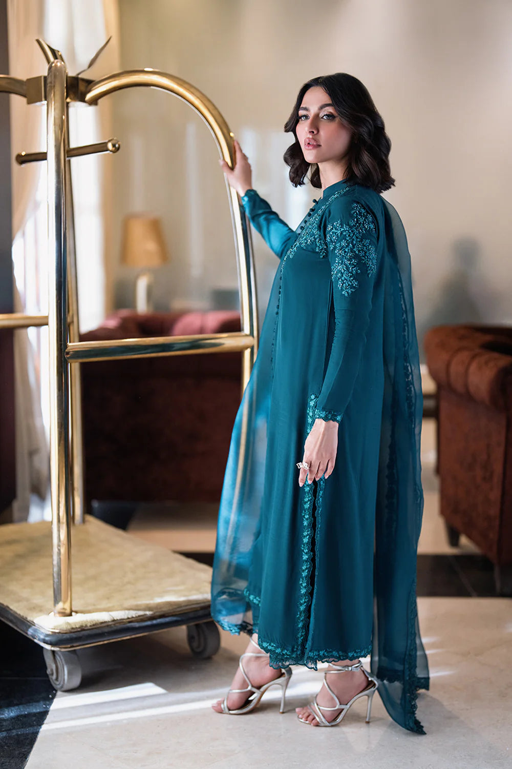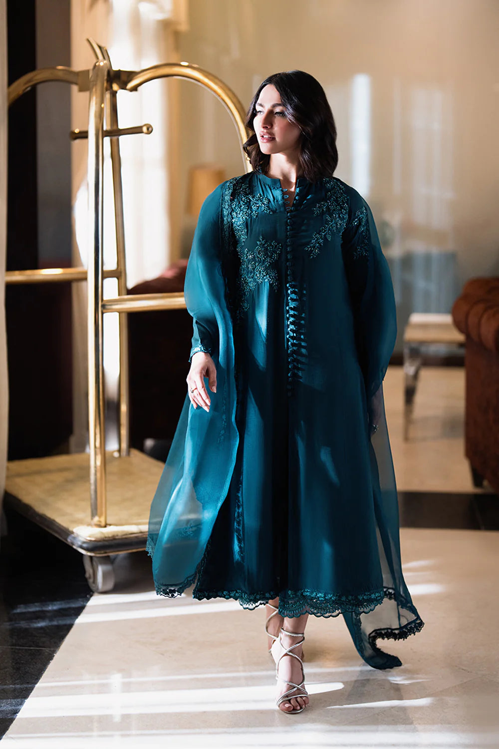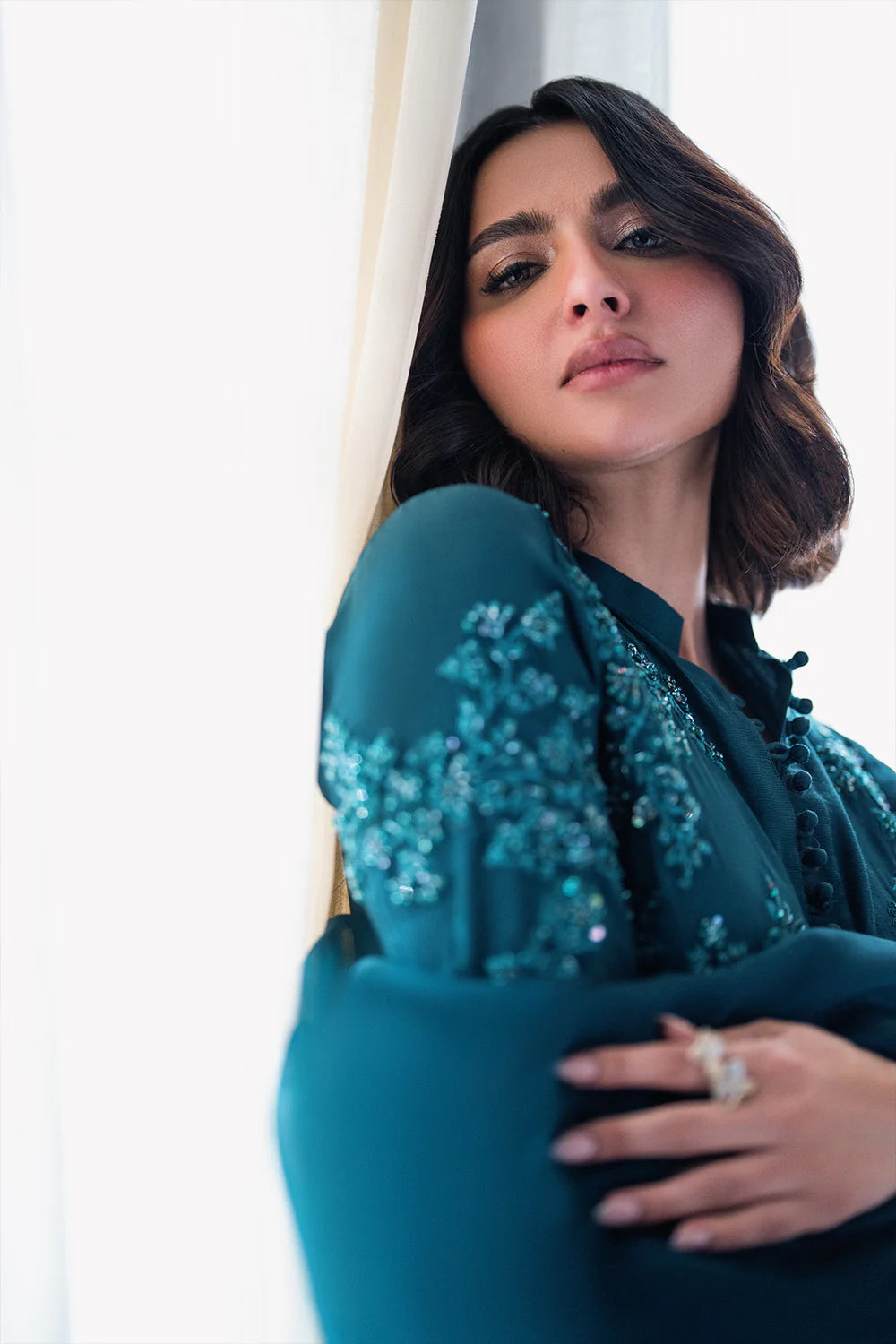 Introducing Cypress Mist – a stunning emerald green three-piece crafted from luxurious raw silk. The front and sleeves are adorned with delicate hand-embroidered bunches, adding a touch of intricate artistry to the design. Paired with flapper trousers and a pure organza dupatta, this Diva outfit combines timeless elegance with modern flair, perfect for making a sophisticated statement