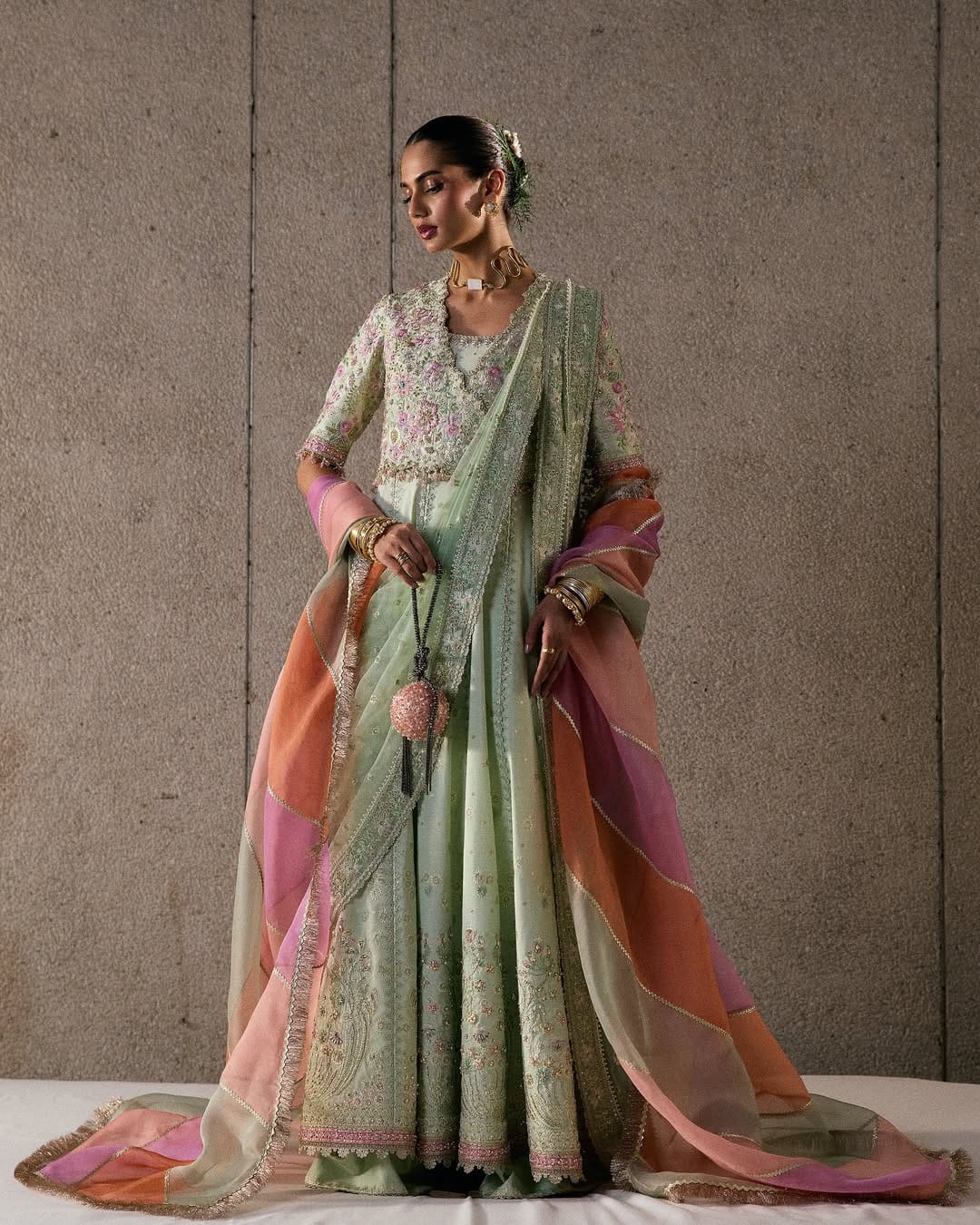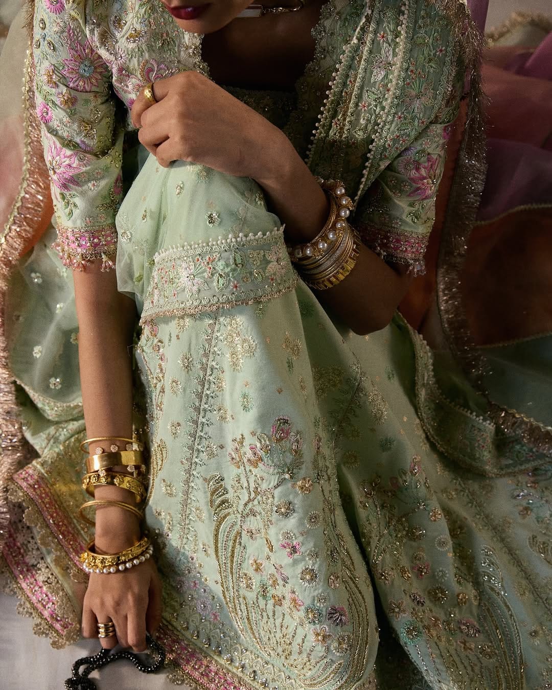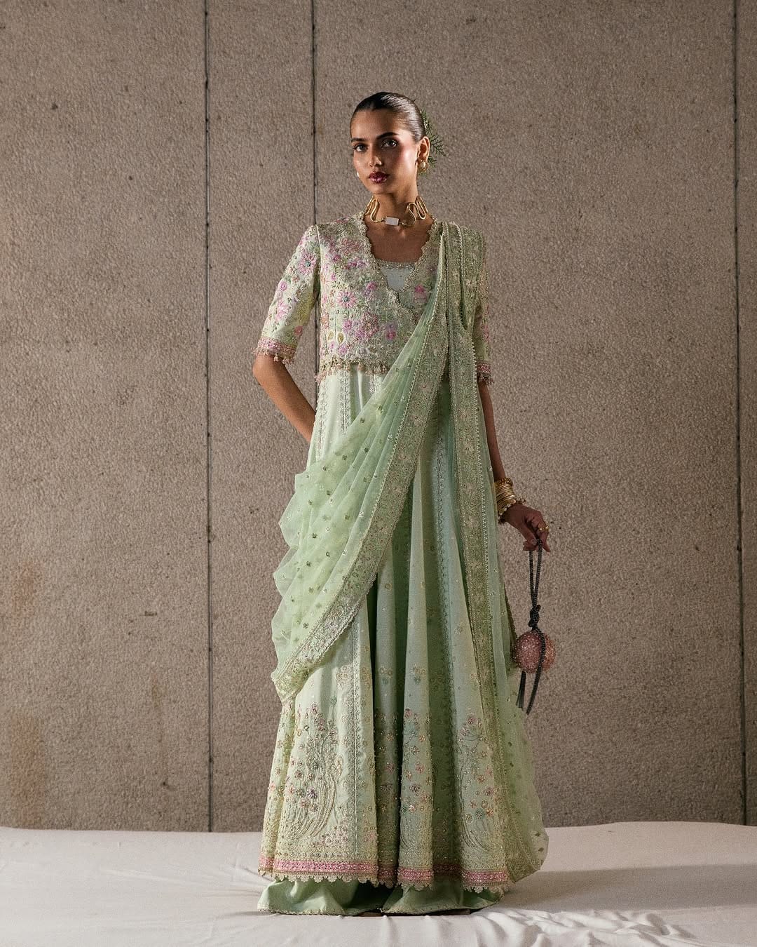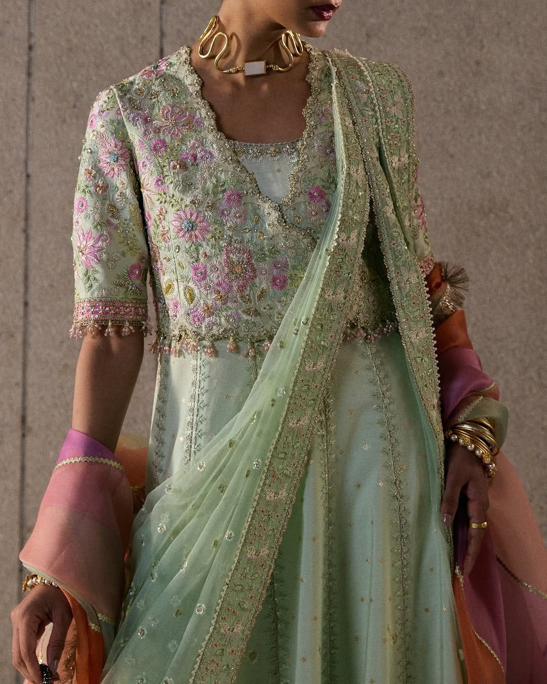 Aymara Stitched-(6pc)- In refreshing icy mint, this six-piece look features a jacquard silk pishwas with a scoop neckline, hot pink contrast borders, and lace-lined panels. Sleeve options include half or full, both embroidered and finished with tassels. A raw silk coatee wraps over the pishwas, fully embroidered with multicolored handwork, scalloped edges, and tassel detailing. Paired with matching loose raw silk pants and a printed slip. The double-drape net dupatta is finished with embroidered borders and a soft mesh spray, offering versatile styling. Can be ordered with half - sleeves and full sleeves, also can be paired with extra chatta-patti dupatta as shown (ordered separately)