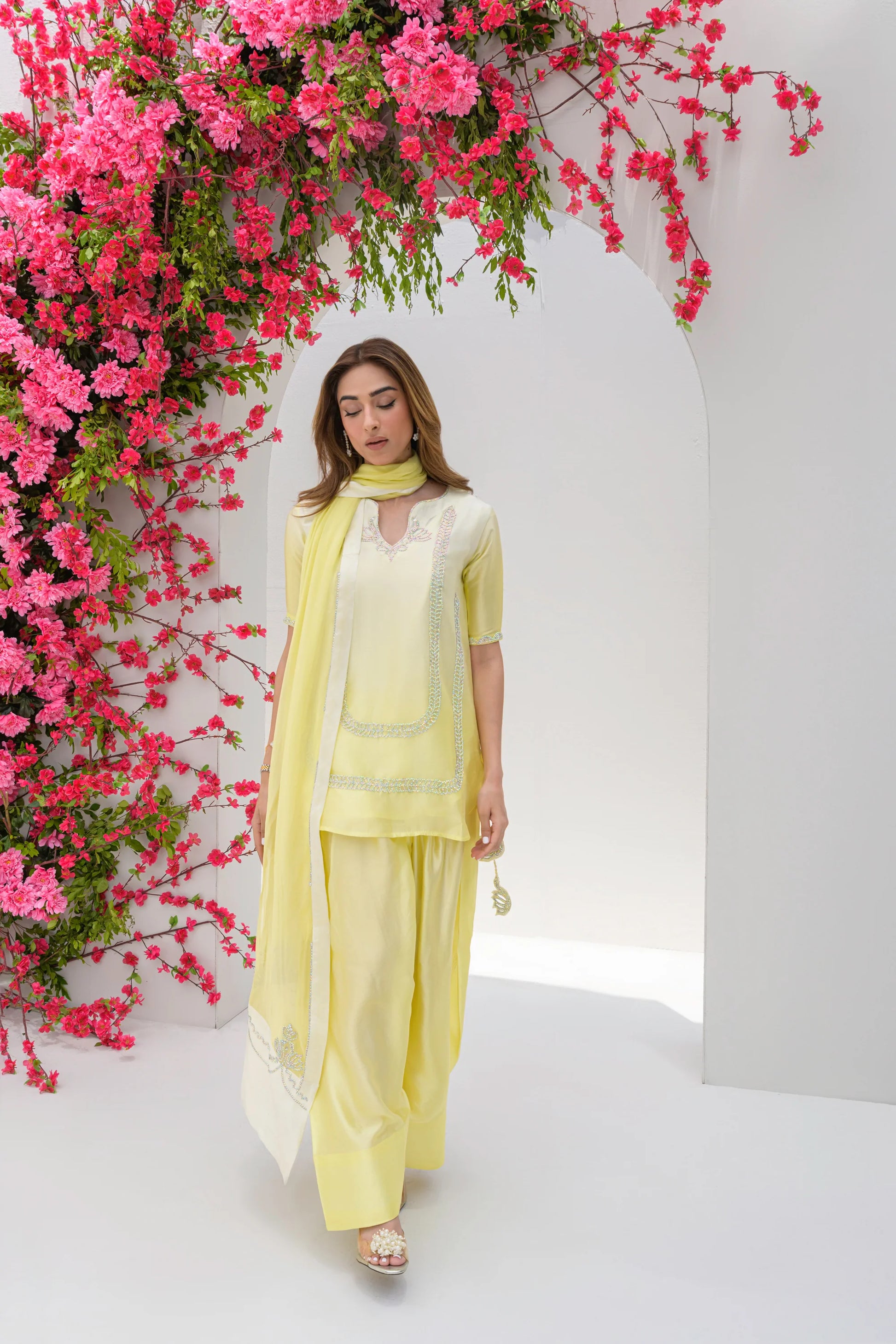 ButterCup is a radiant two-toned ombré ensemble in lemon yellow, the trendiest shade of the season. The short shirt and farshi shalwar are made from luxurious pure sheesha silk, paired with a sheer sheesha organza dupatta. Intricately embellished with stonework in elegant swan motifs and finished with handcrafted swan tassels, this outfit exudes charm and sophistication. The shalwar is crafted from korean raw silk