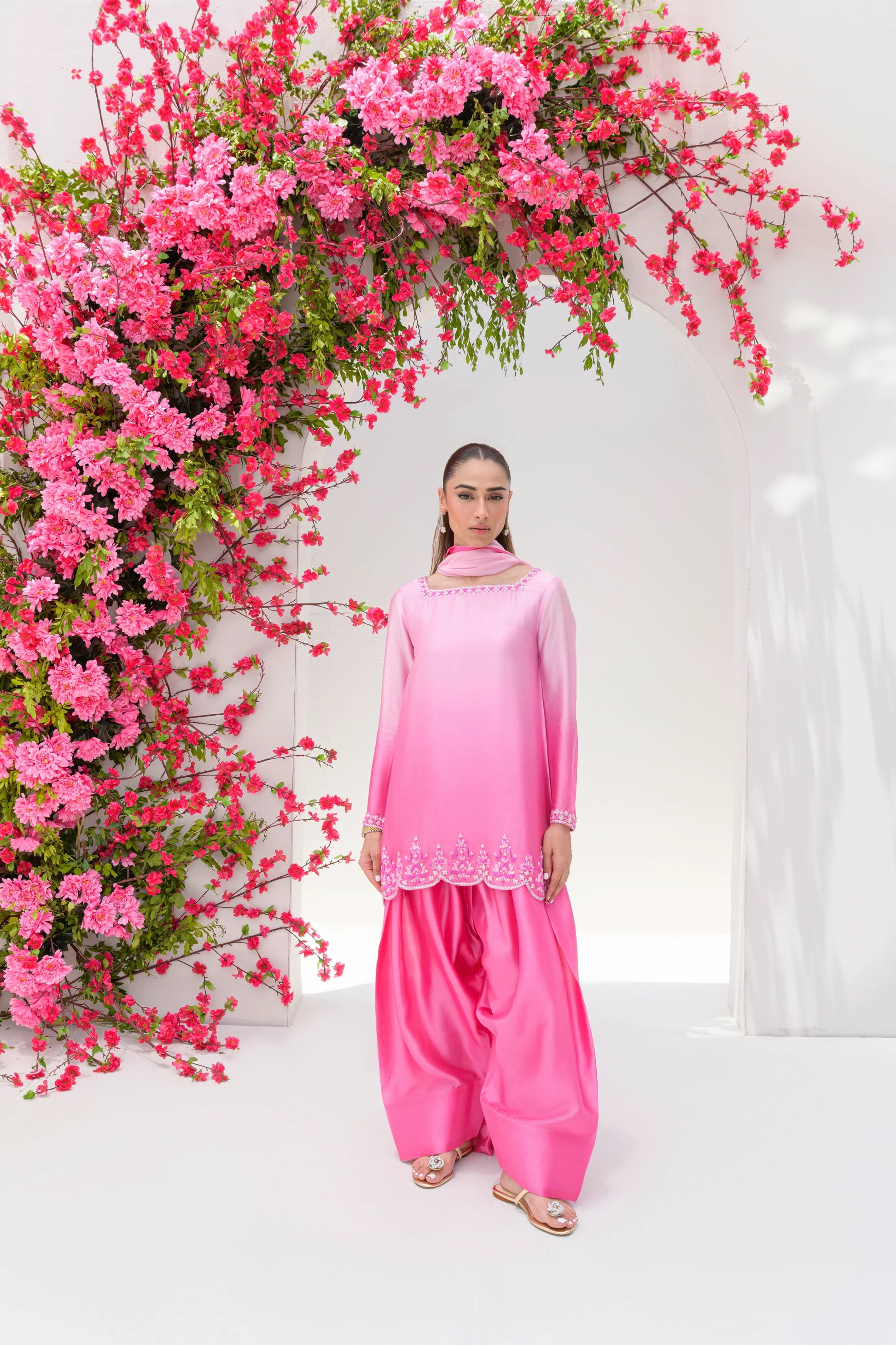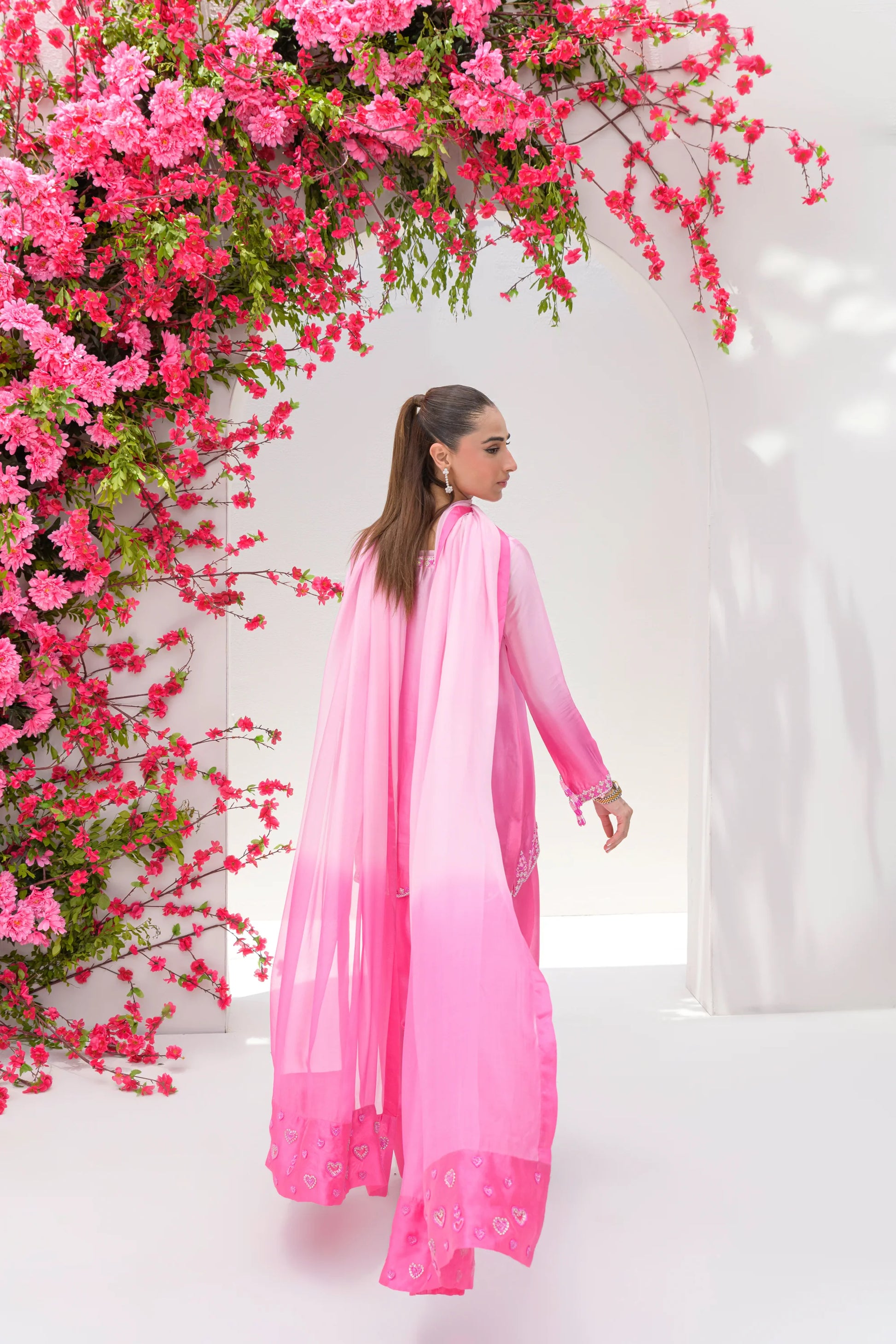 CandyFloss is a dreamy two-toned ombré ensemble in soft candy pink hues. The short shirt and farshi shalwar are tailored from pure sheesha silk, paired with a flowing sheesha organza dupatta. Delicate sequin and stone work in cool pink shades adorn the neckline and daman, while shimmering sequin hearts grace the edges of the dupatta, adding a whimsical touch.
