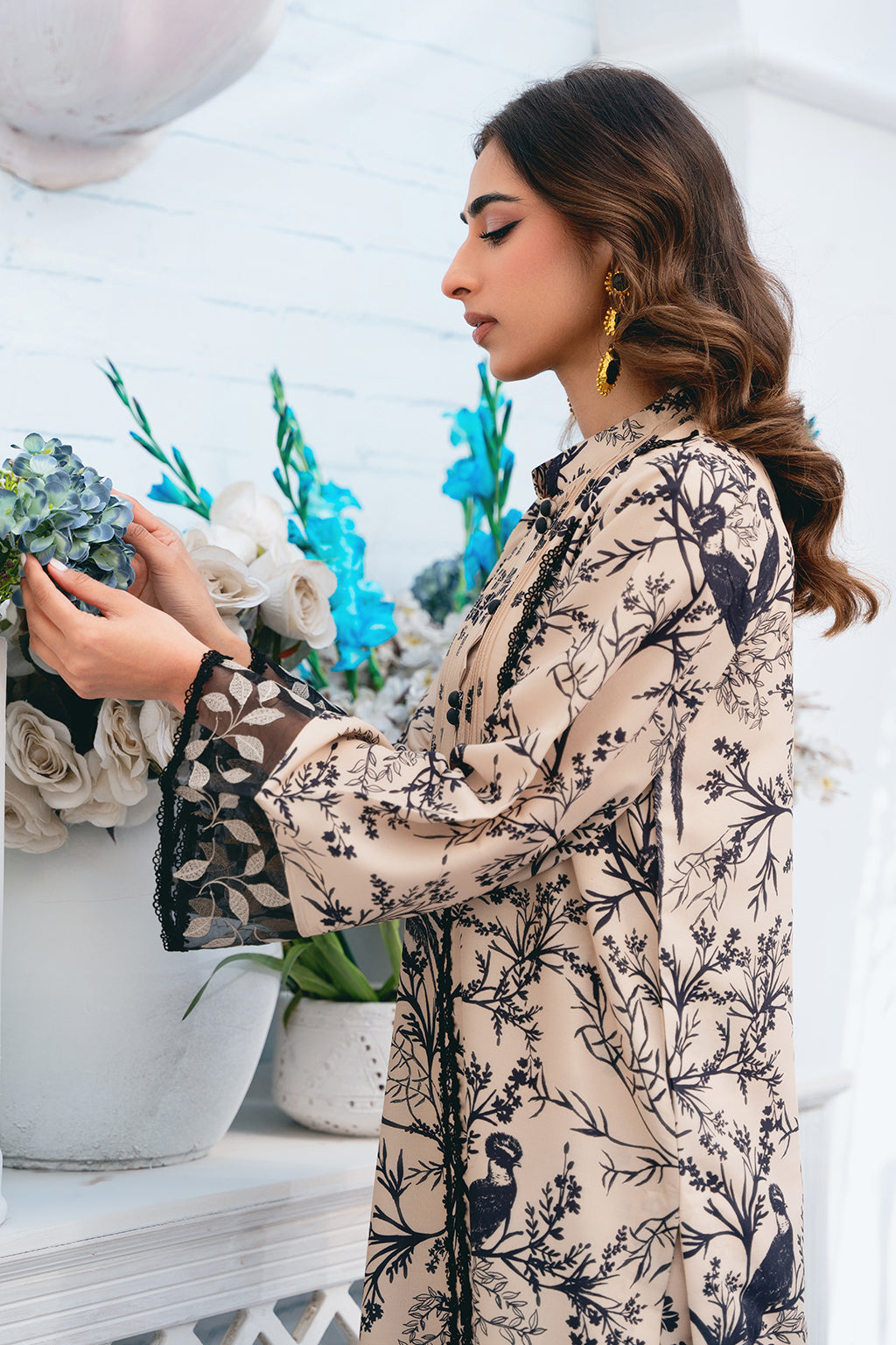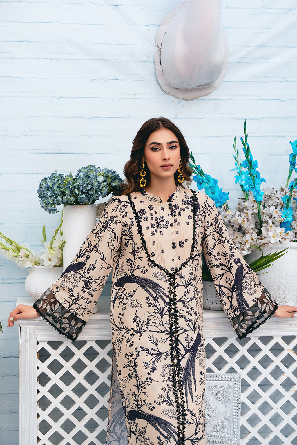 Beige and black long fake front open shirt with stitching details around the neck and embroidered sleeves border, paired with fitted pants.