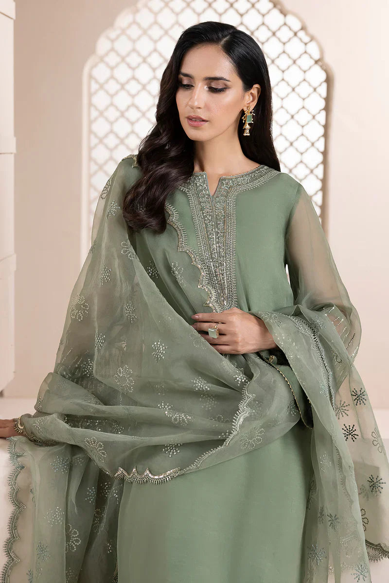Channelling the radiance of sophistication through this sage green coloured 3 piece chiffon ensemble. The intricated silver embroidery adorns the neckline and sleeves of the shirt. It comes with an embroidered organza dupatta with floral patterns and scallop border. The loose grip trouser depicts the eloquently embroidered florals and wave patterns. The blend of outfit's sage green and silver embroidery exudes a luxury vibe.