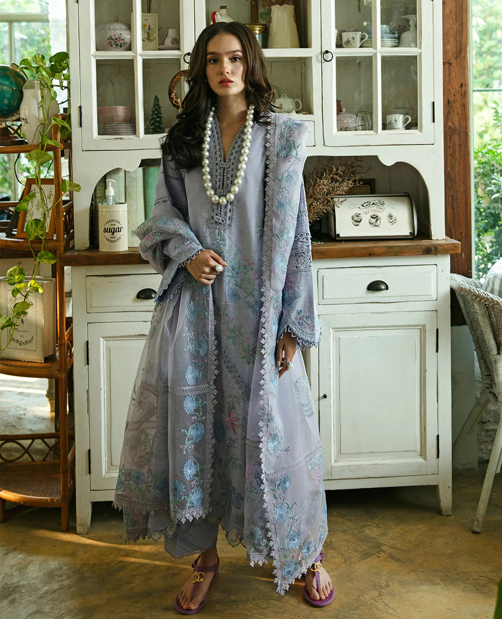 Eugine is a serene ensemble in a delicate periwinkle hue, featuring a slub lawn shirt with refined embroidery. It's tailored with scalloped stitching and adorned with dyed laces for a graceful touch. The look is completed with an organza embroidered dupatta, its edges detailed with lace, creating an air of elegance and simplicity.