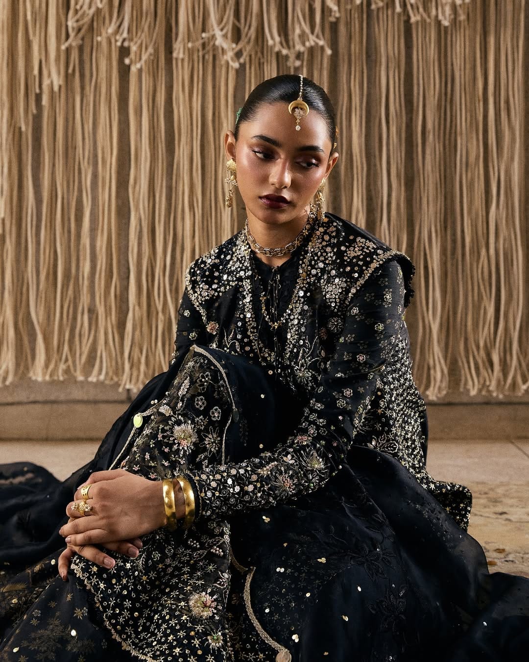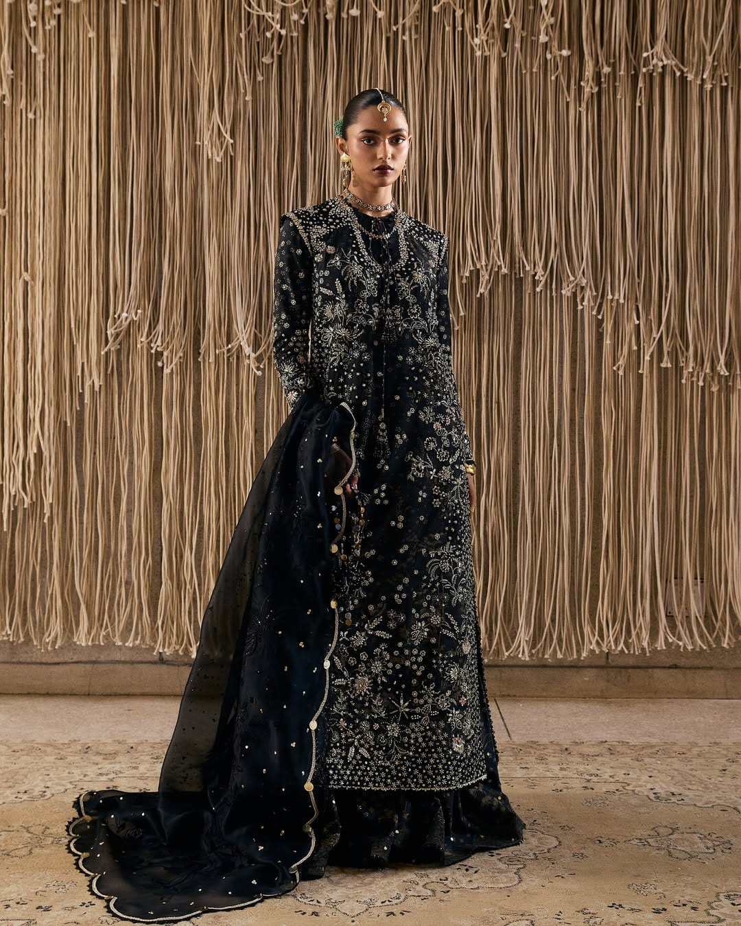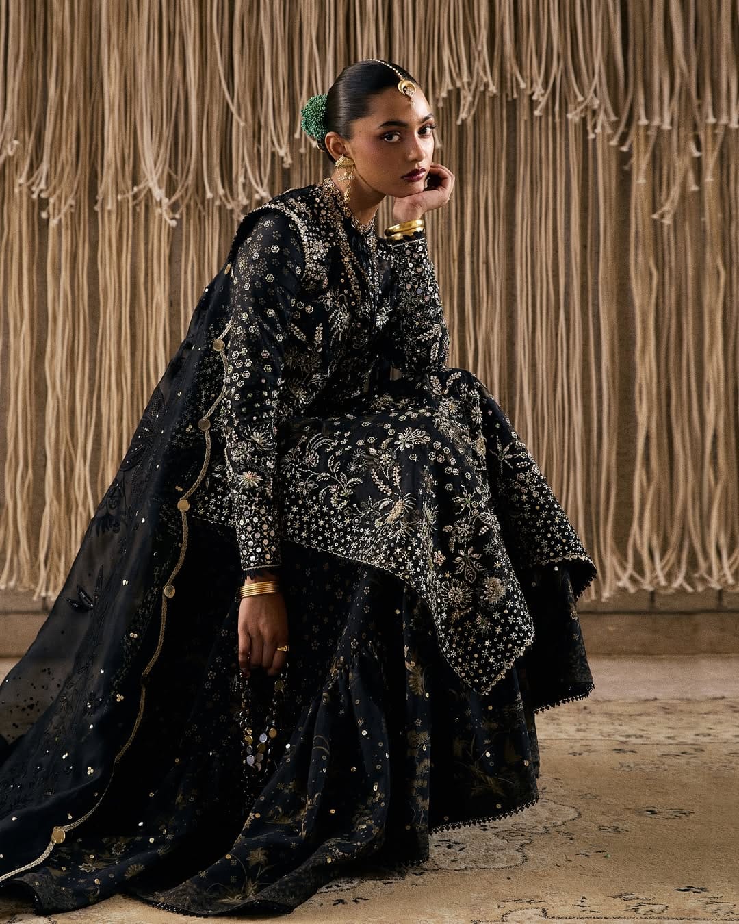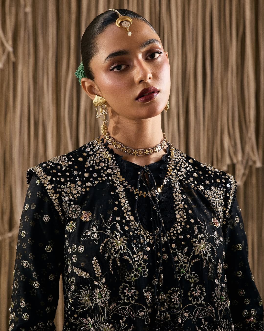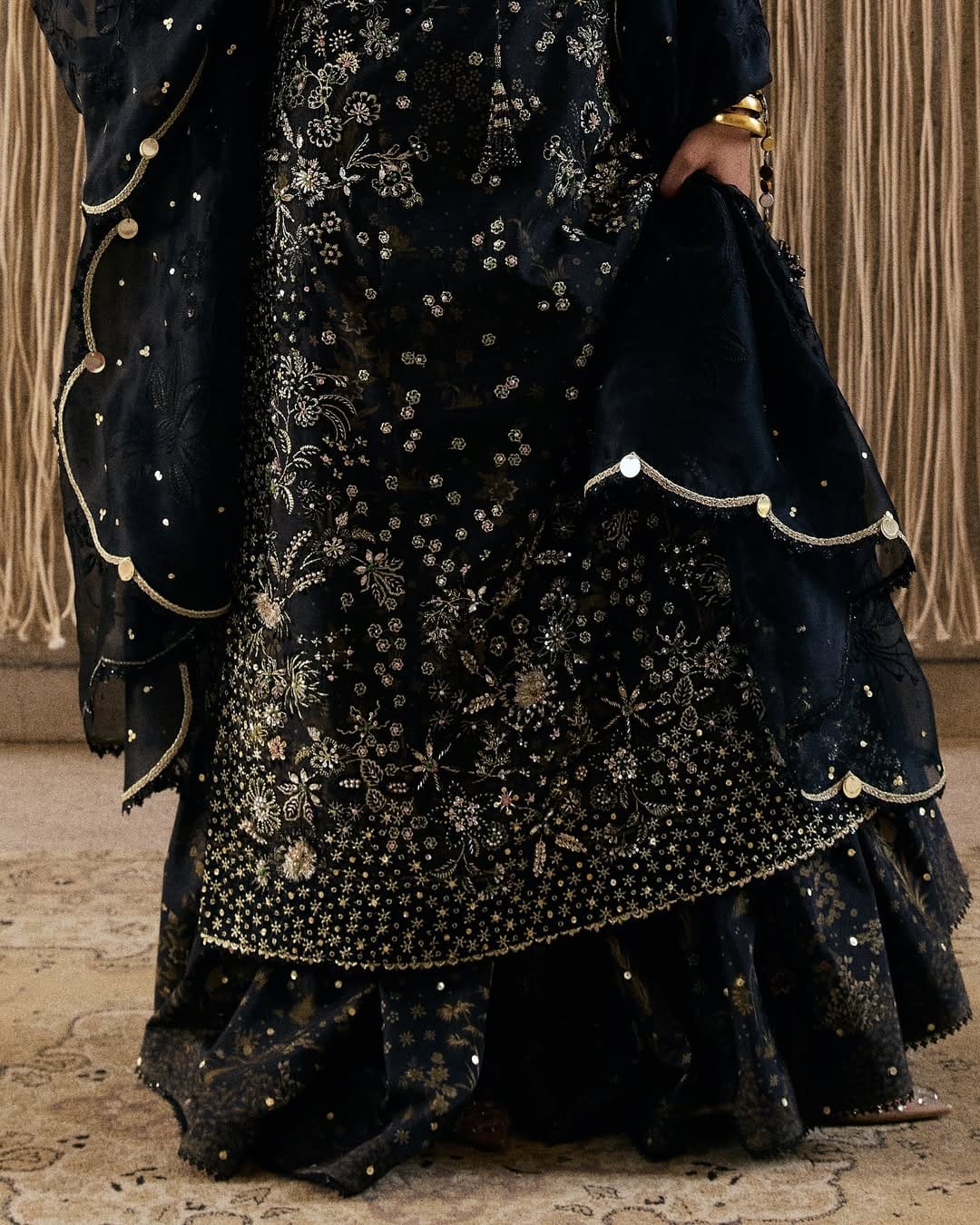 Kiaray Stitched-(3pc)- In deep coal black, this three-piece set features a raw silk printed straight shirt with embroidered detailing around the crew neckline and organza patching. Accented with lace extending to fitted sleeves that widen at the shoulders for a capped look, finished with gold tassels. Paired with matching raw silk gharara pants detailed with low lace and gold sequin spray. The organza dupatta completes the look with a scalloped border and gold sequin coin tassels.