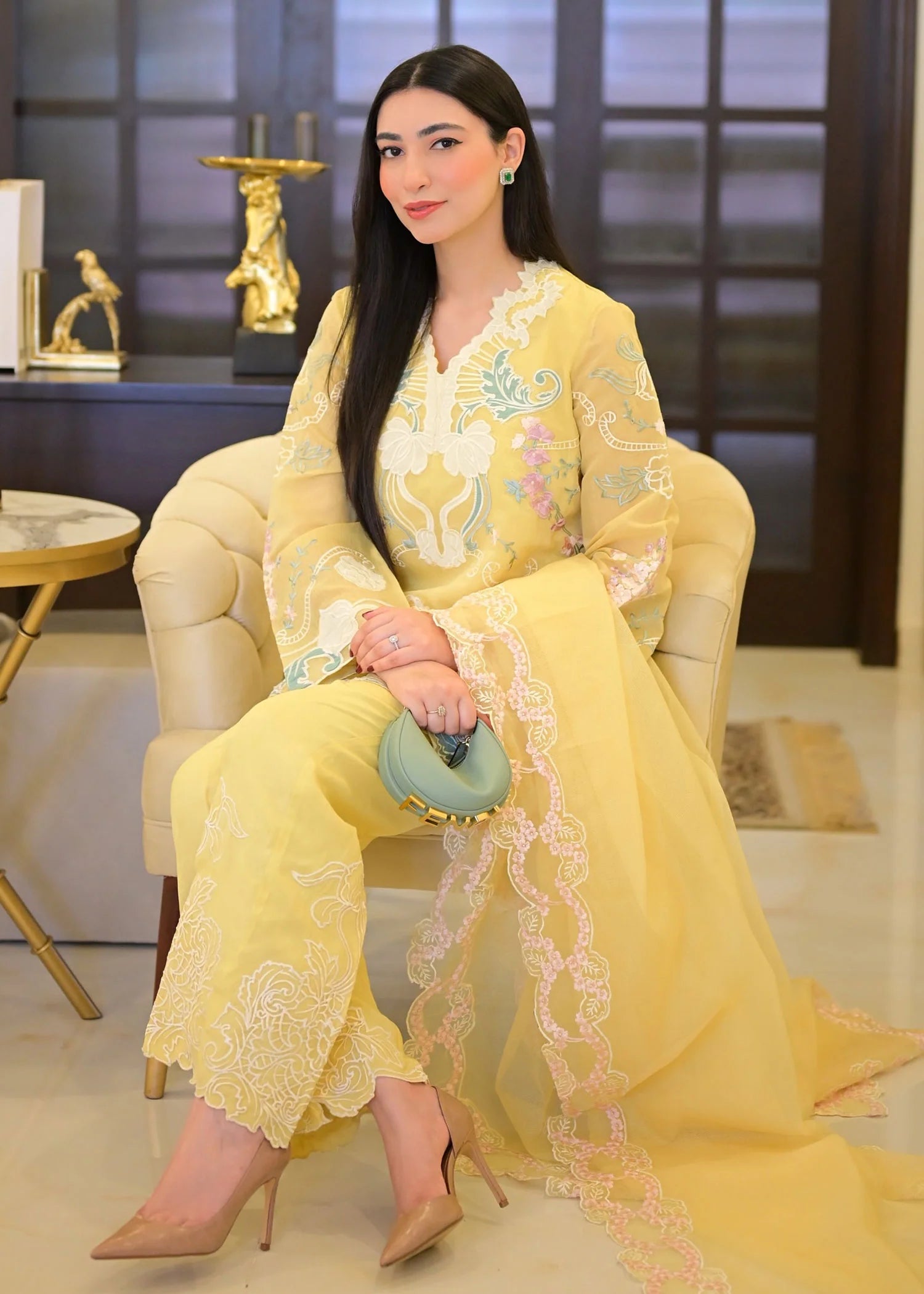 Dandelion hues is a radiant celebration of refined elegance, where the soft warmth of a pale yellow canvas merges with lilac floral embroidery, sage leafy vines and ivory appliqué in organza and cotton silk. This exquisite design from Saira*Shakira’s Casual Pret Collection’25 exudes a perfect balance of timeless charm and contemporary luxury.