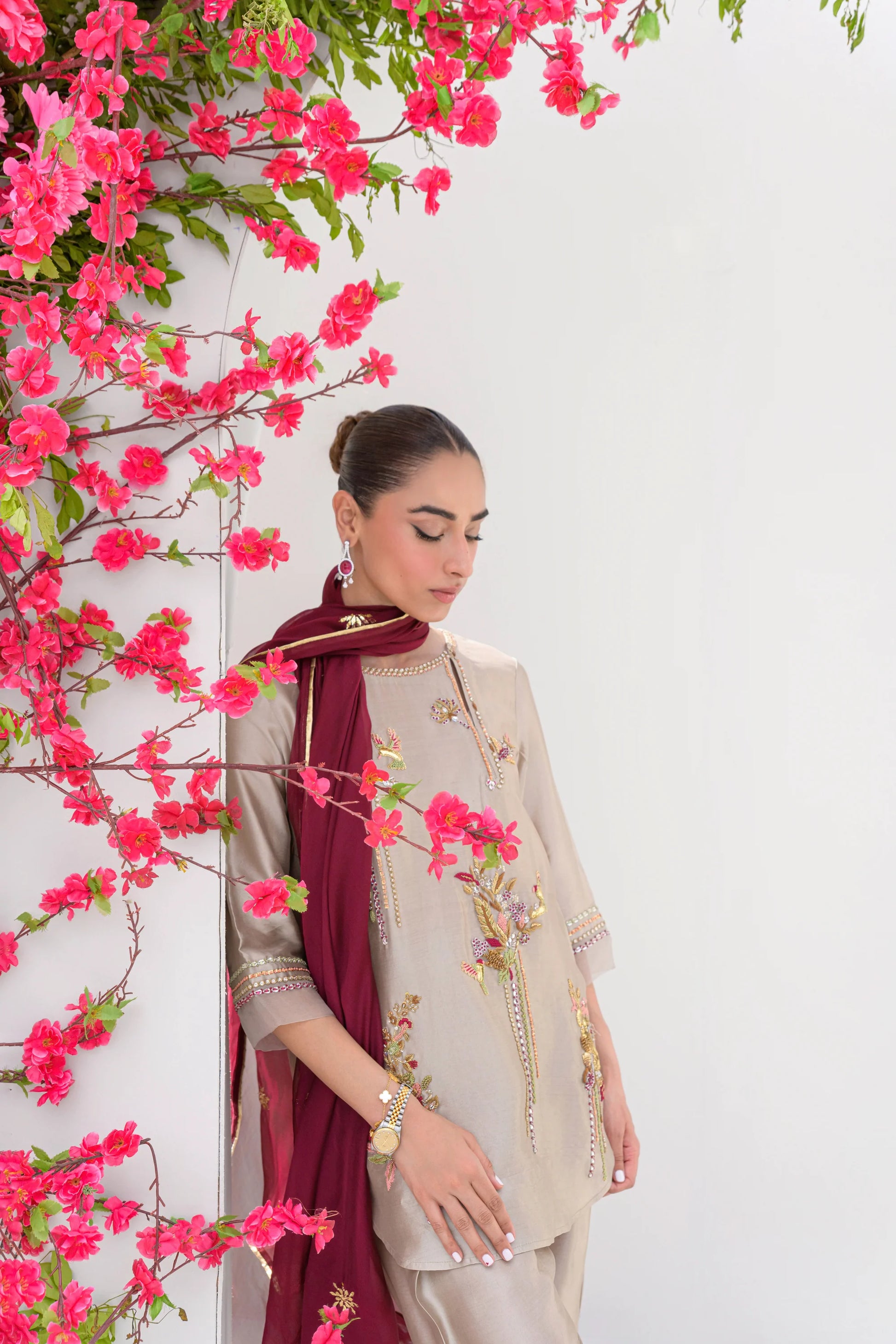 An elegant ivory short shirt paired with a sleek shalwar, both tailored from pure Sheesha silk and perfectly complemented by a rich maroon Kamdani dupatta in pure Sheesha organza. The shirt features intricate embroidery with Kamdani, sequins, Kora, and Resham work—blending subtle shimmer with timeless grace. A refined and graceful choice for summer sophistication.