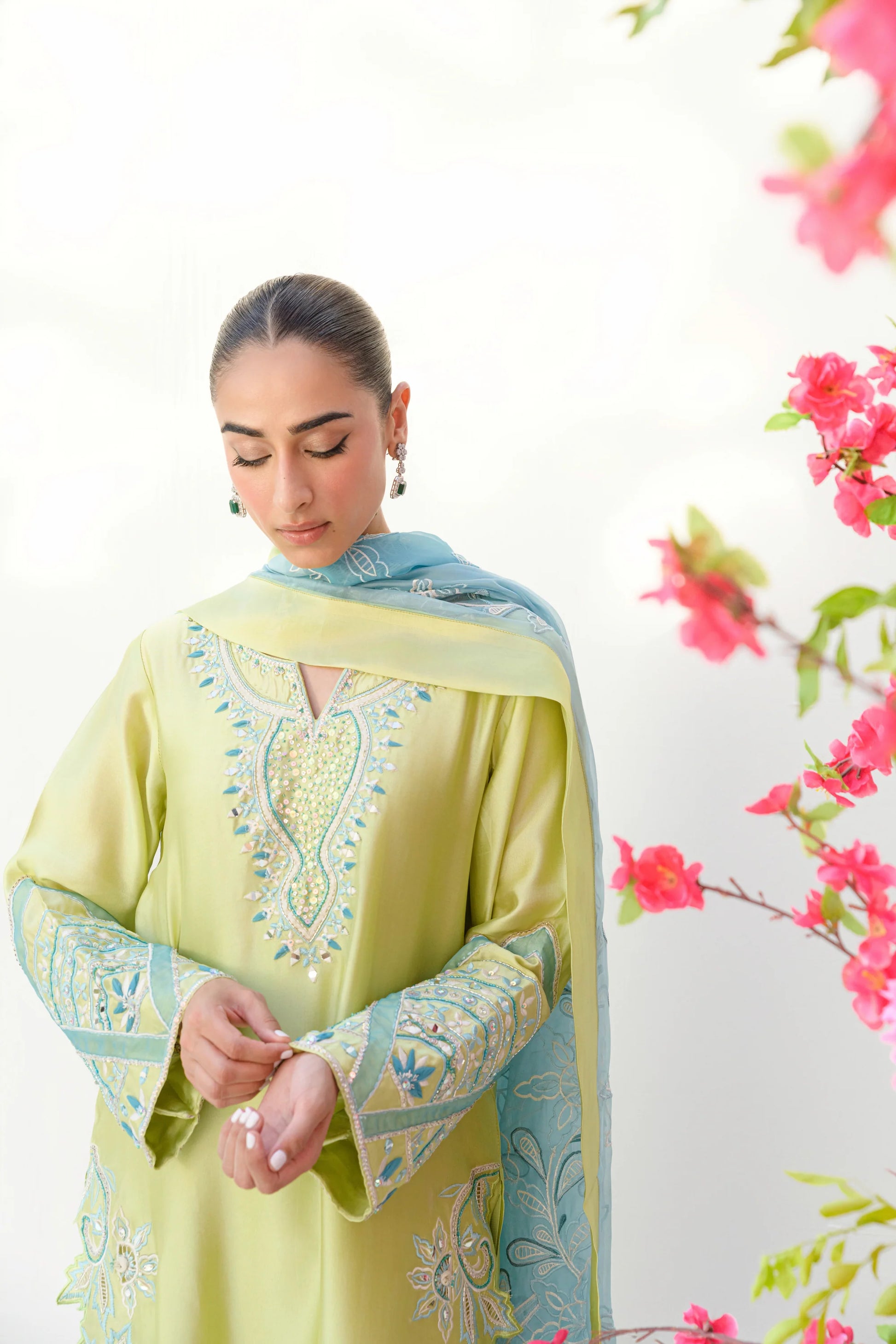 A refreshing summer ensemble featuring a cool-toned lime kiwi shirt paired with matching pants, all crafted from pure Sheesha silk. The shirt is beautifully embellished with a blend of hand and machine work, adorned with sequins and mirror accents for a radiant finish. The look is completed with an icy blue Sheesha organza dupatta, bringing a breezy, eye-soothing charm—perfect for the warm season.
