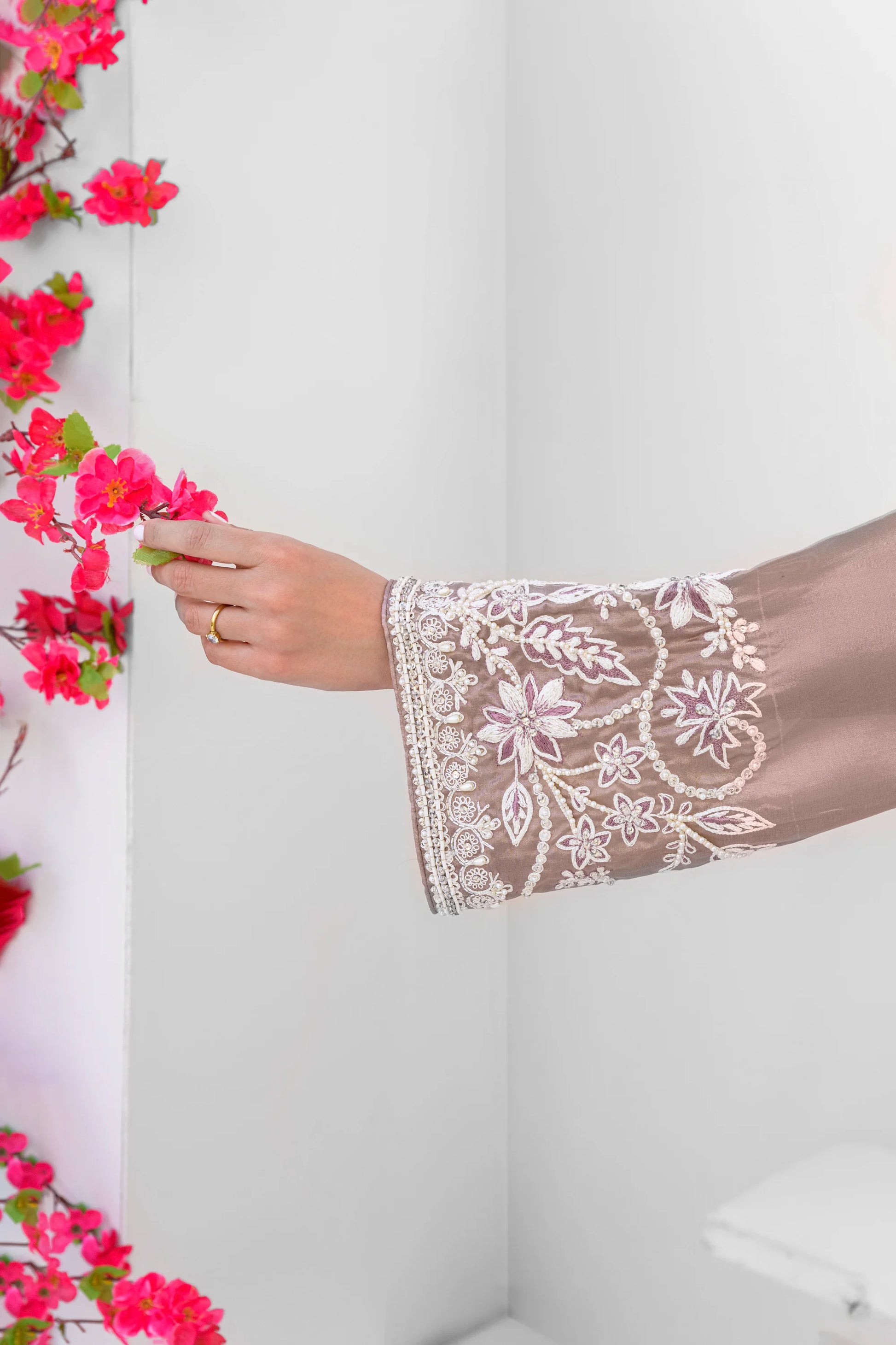 A stylish ensemble in dusty rose, featuring a short cape jacket paired with flowy pants. Crafted from premium pure sheesha silk, the shirt is machine-embellished with delicate handwork. A chic and elegant choice for the season. It’s a two piece set and the flowy pants are made on korean rawsilk.