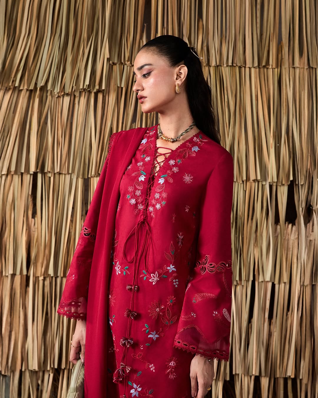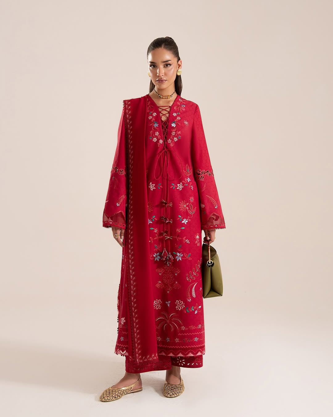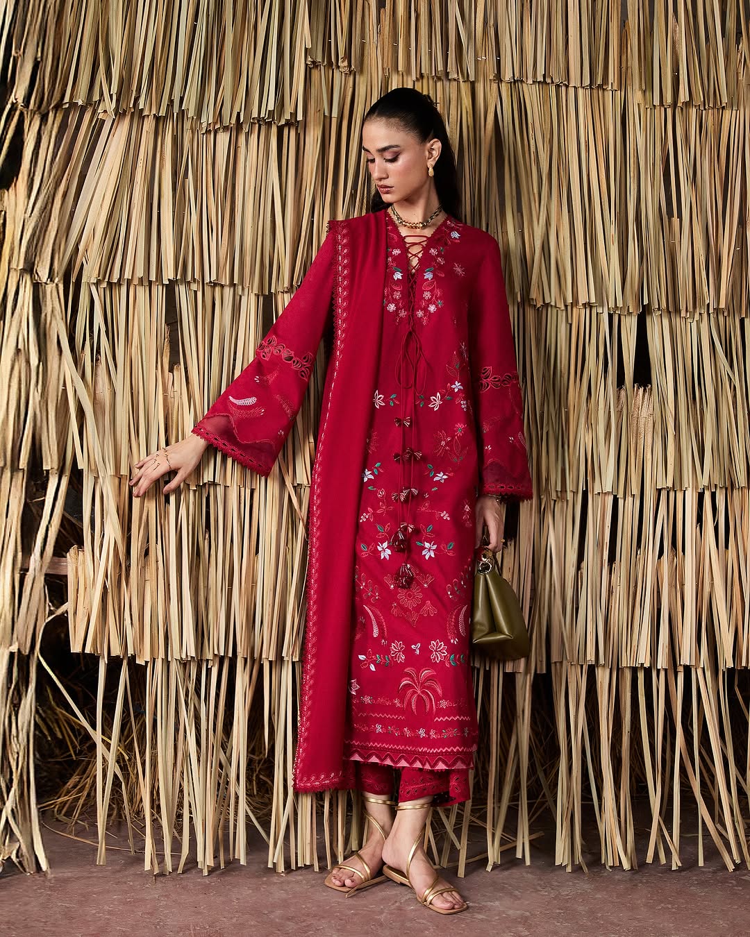 Bold and graphic, this ruby red set commands attention. The straight jacquard shirt is framed by tonal patchwork and geometric embroidery in vivid contrast, while appliqué elements and organza-layered sleeves add edge. Finished with clean culottes and a chiffon dupatta bordered in lace and embroidery—it’s depth, structure, and seasonal power in one.