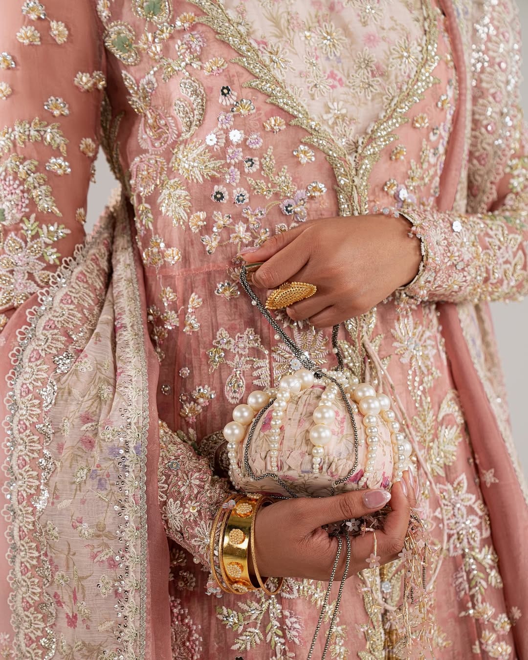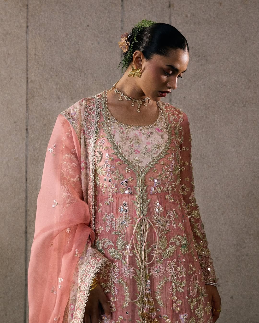 Novara Stitched-(4pc)- In a romantic blush rose hue, this four-piece design pairs a printed crushed pishwas with a heavily embroidered front-open organza jacket. Embellished with handwork in gold and silver, the overlay features tassel detailing at the front and a scooped V neckline framing the curved round neckline of the pishwas beneath. Full fitted sleeves with embroidery and tassels add refined elegance. Styled with matching printed sharara pants adorned with floral accents and detailed hems. The organza dupatta completes the look with printed borders that flow inward with delicate embroidery