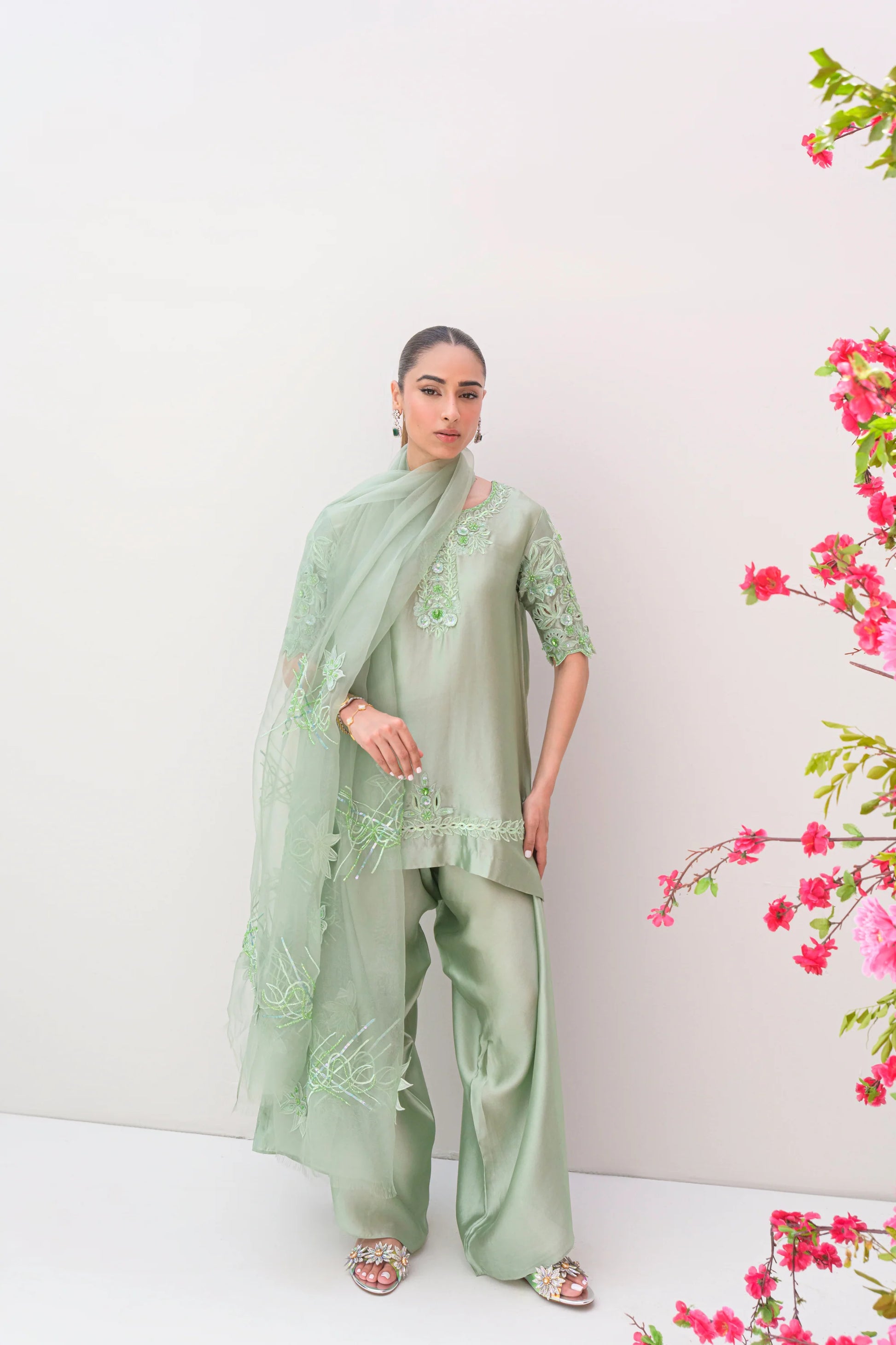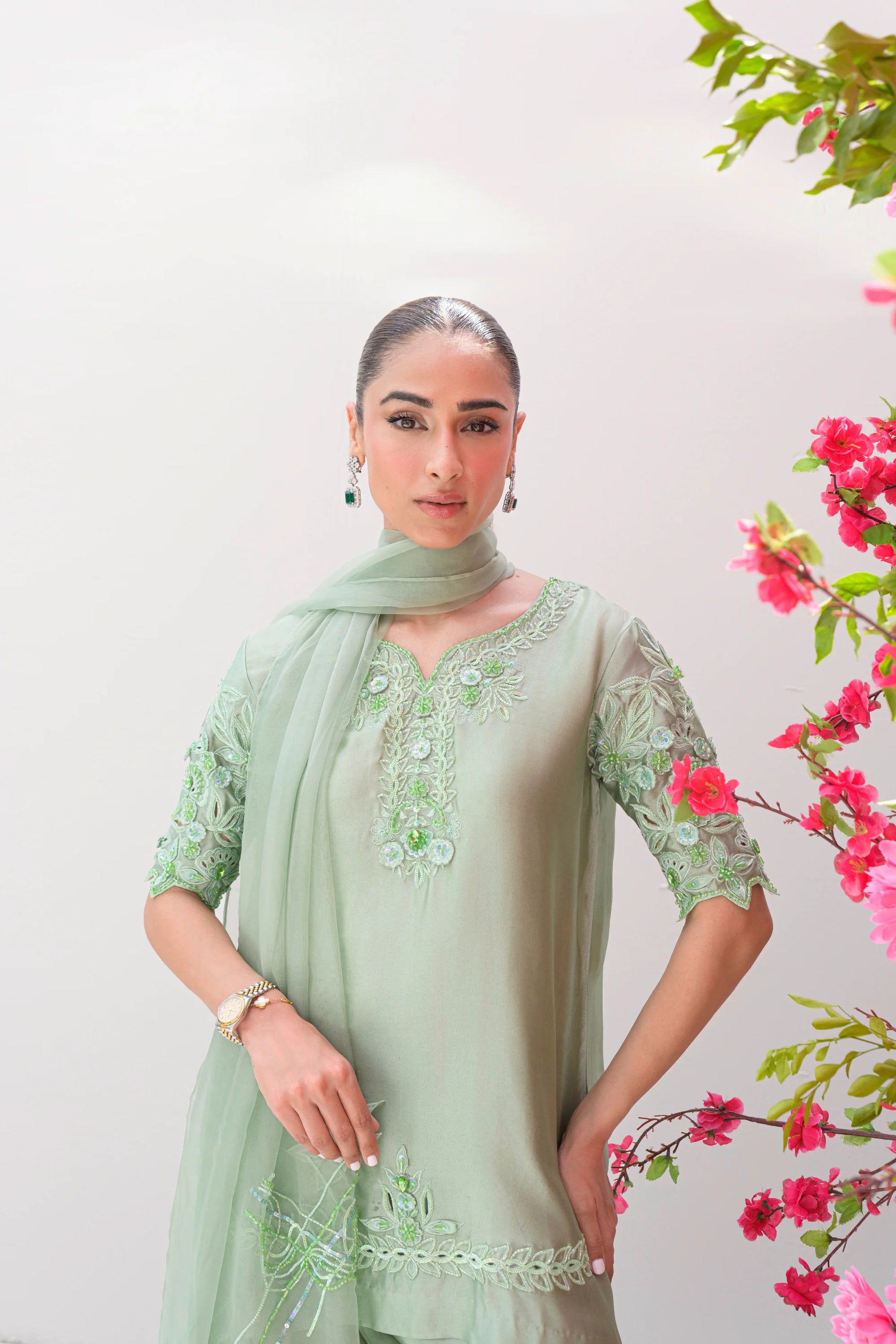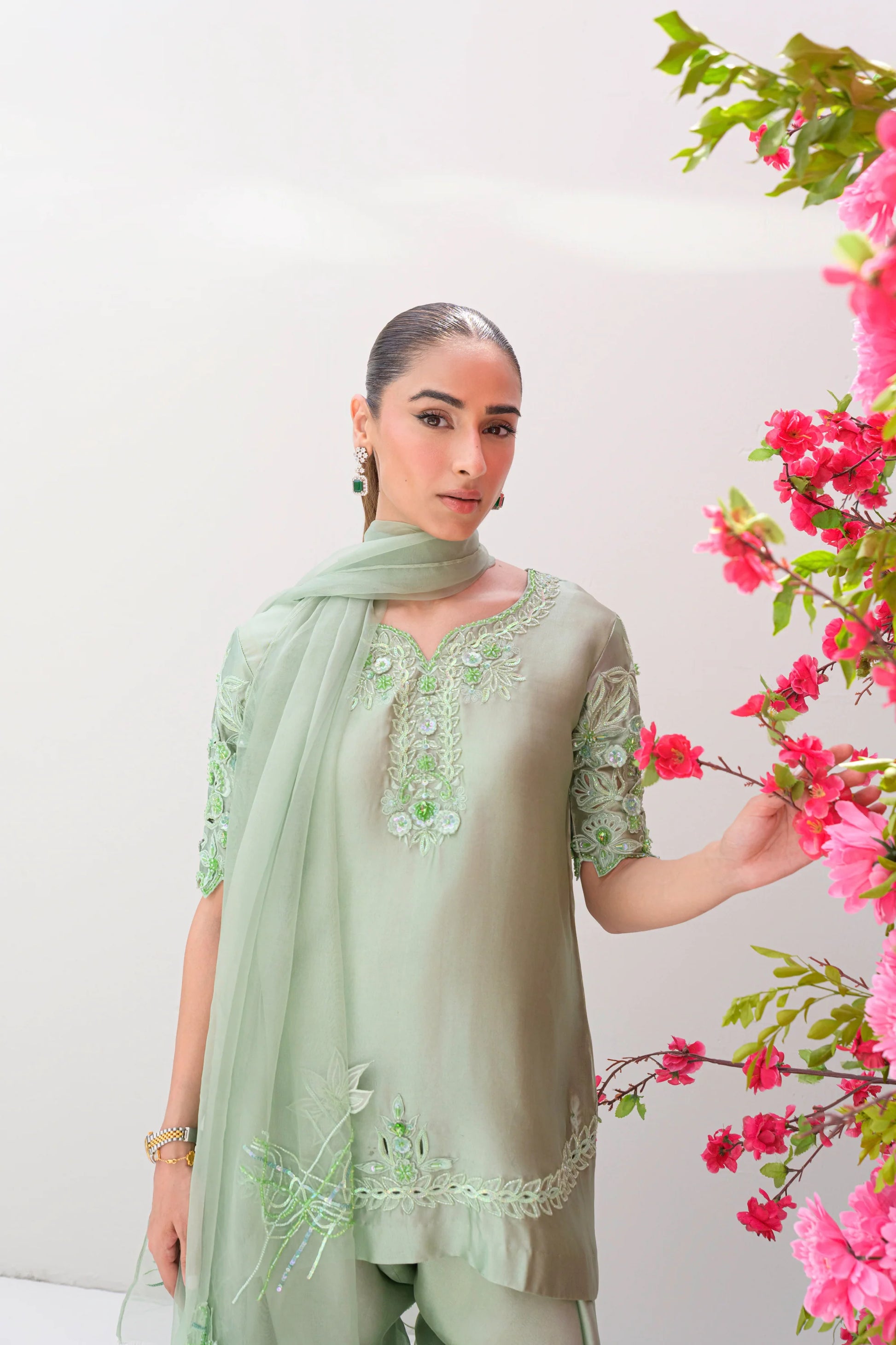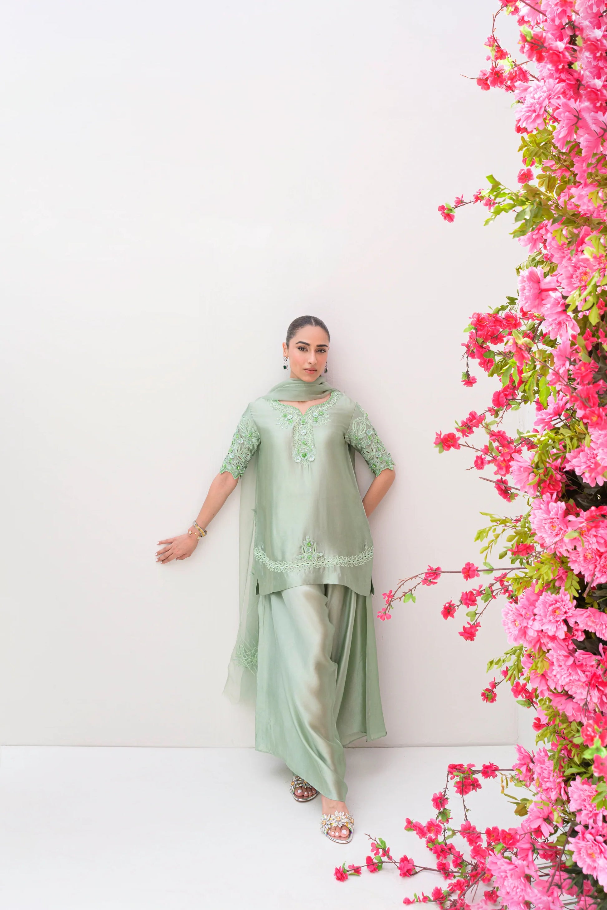 A refreshing mint-toned ensemble featuring a short-style shirt and flowy pants. The shirt is crafted from pure sheesha silk with machine work, hand embellishments, intricate cutwork, and 3D appliqués. The pure kittan organza dupatta is also adorned with 3D detailing for added elegance. Paired with Korean raw silk pants, this set blends modern charm with artisanal finesse.
