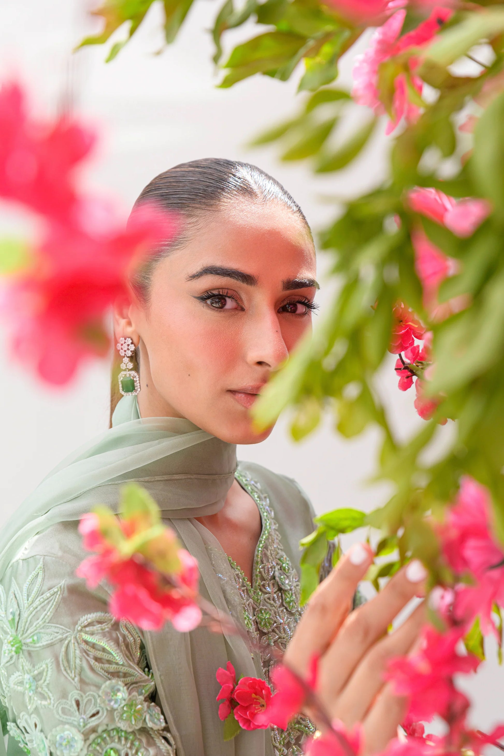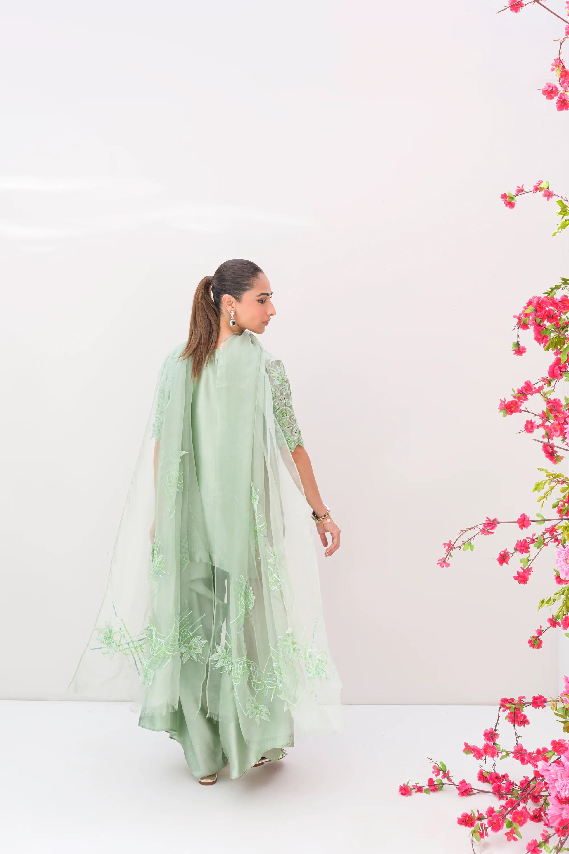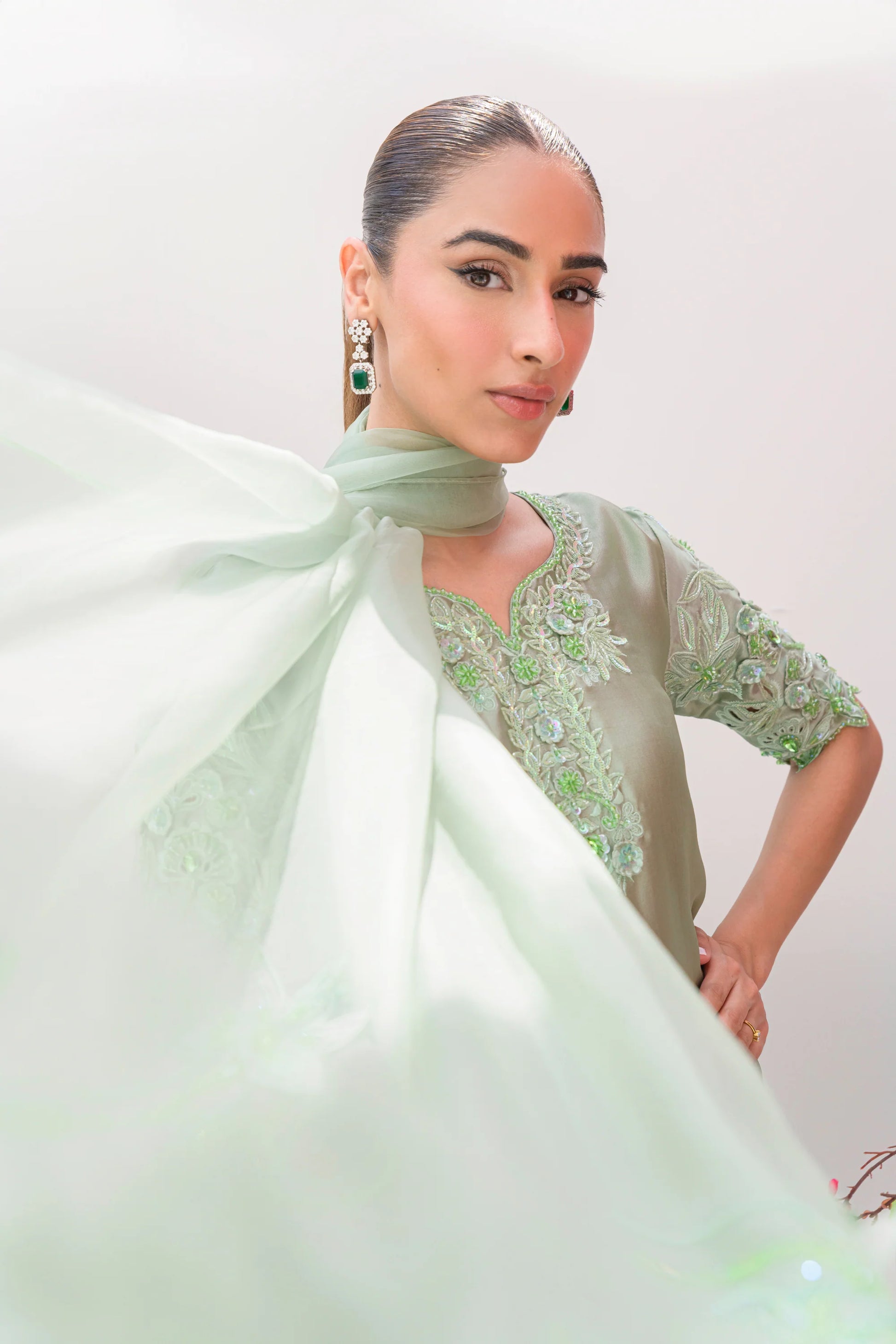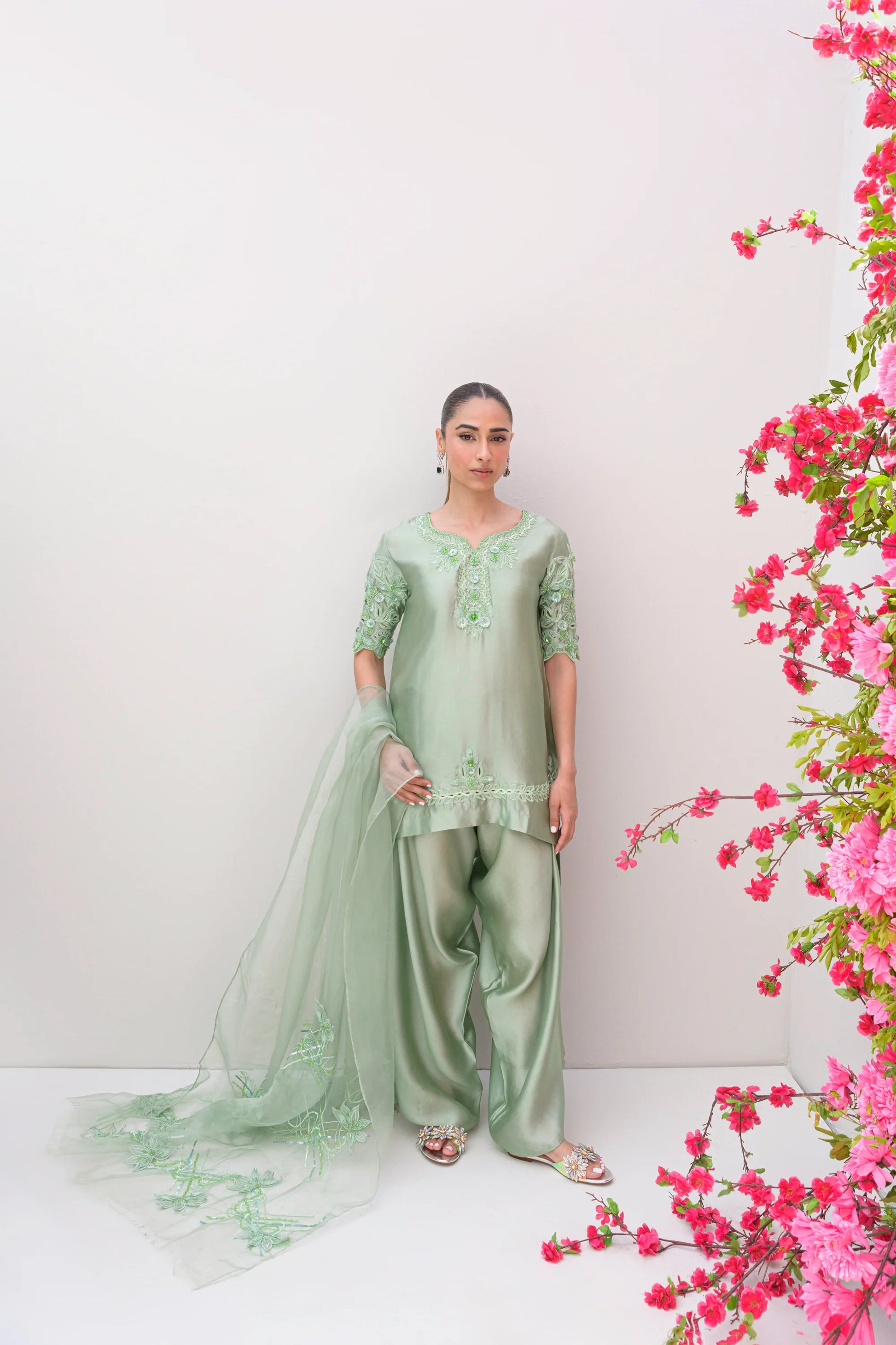 A refreshing mint-toned ensemble featuring a short-style shirt and flowy pants. The shirt is crafted from pure sheesha silk with machine work, hand embellishments, intricate cutwork, and 3D appliqués. The pure kittan organza dupatta is also adorned with 3D detailing for added elegance. Paired with Korean raw silk pants, this set blends modern charm with artisanal finesse.