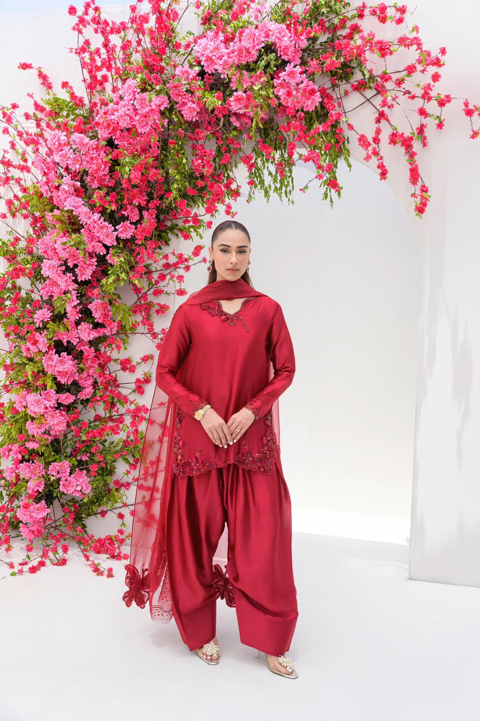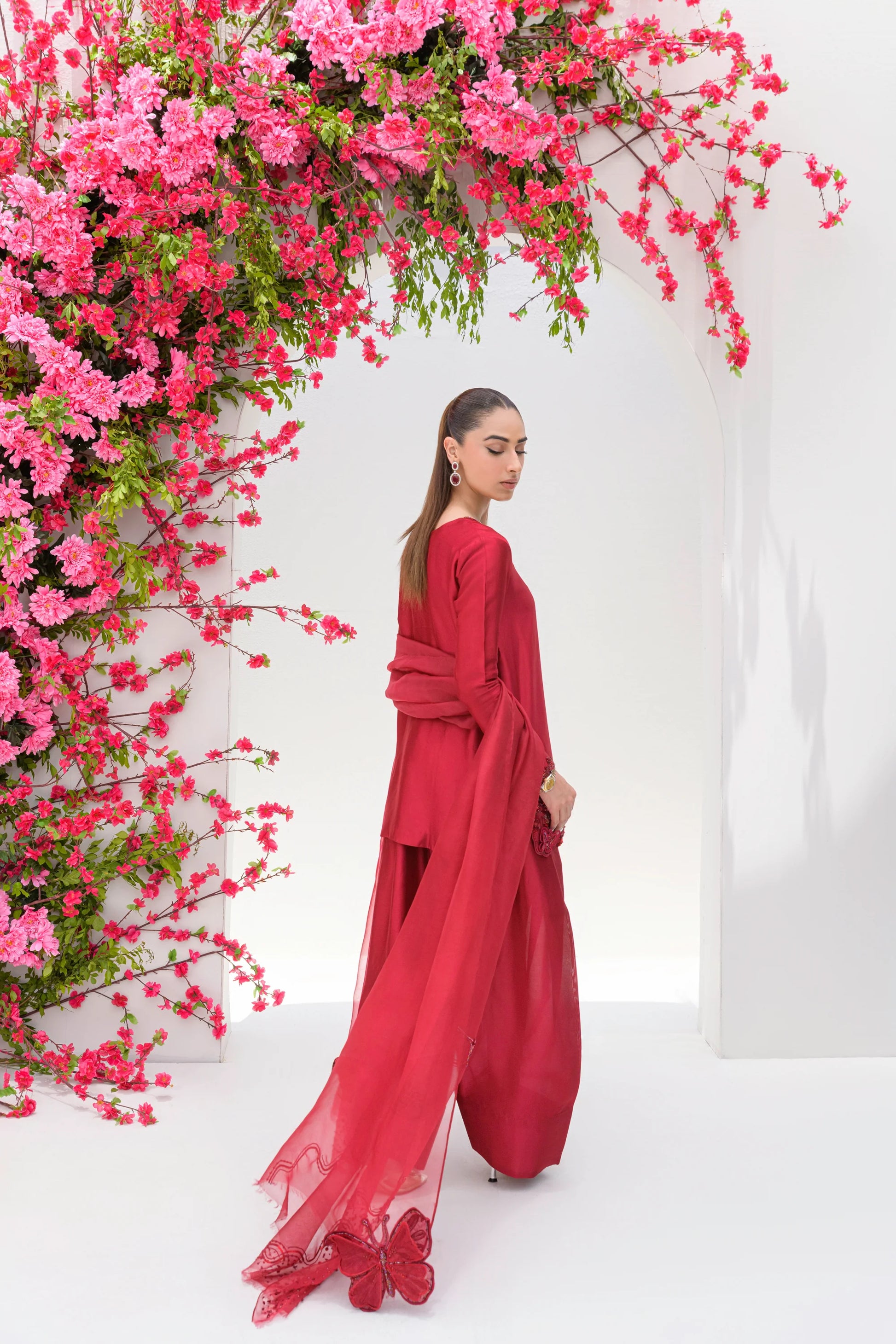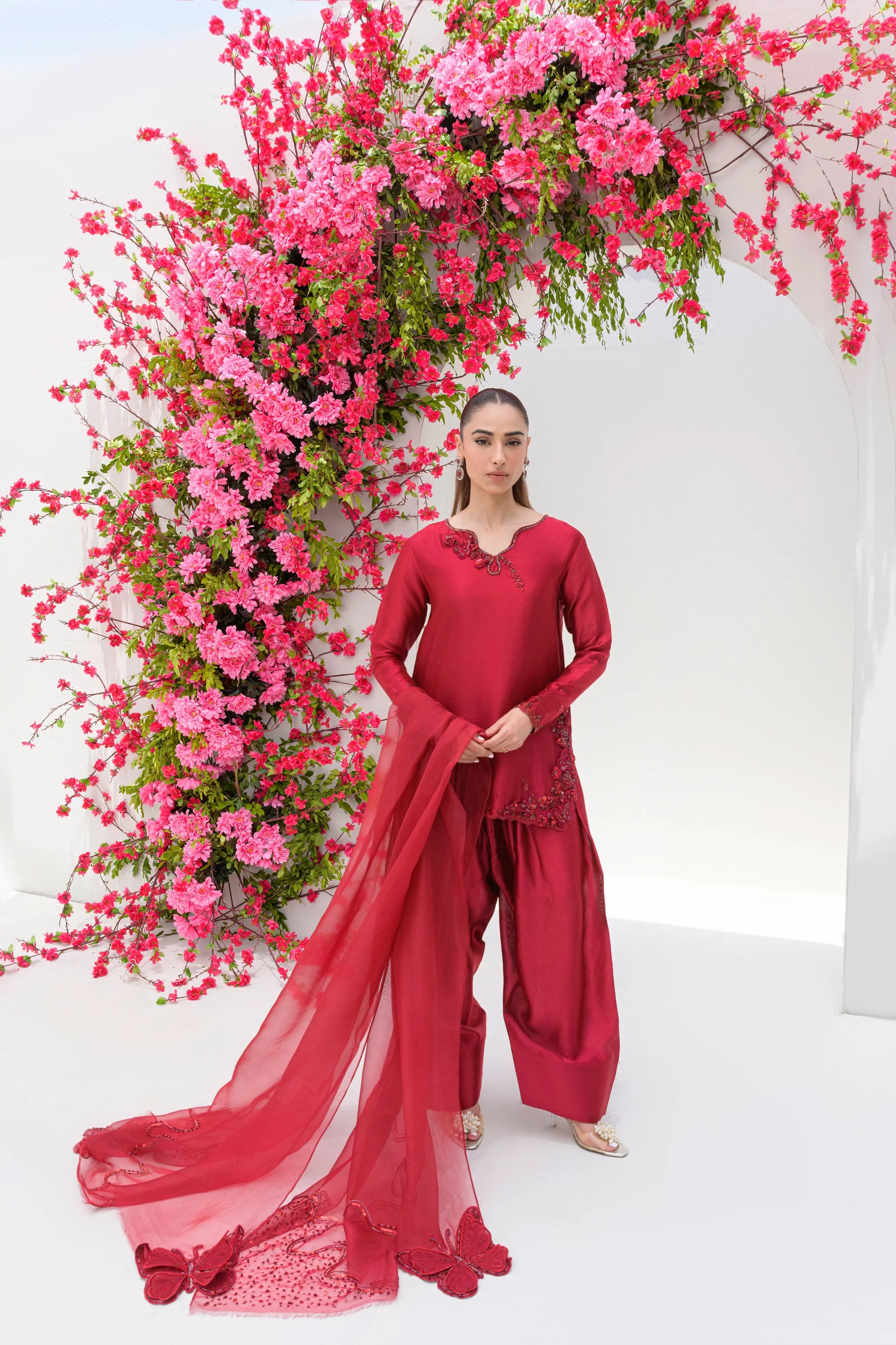 Red Velvet ensemble features a short shirt paired with a classic farshi shalwar. Adorned with intricate same colour maroon embellishments and embossed butterfly motifs, the outfit exudes charm and sophistication. The dupatta, crafted from delicate pure kattan organza, is edged with oversized 3D butterflies for a statement finish. Made from premium sheesha silk, this ensemble perfectly blends tradition with contemporary elegance.