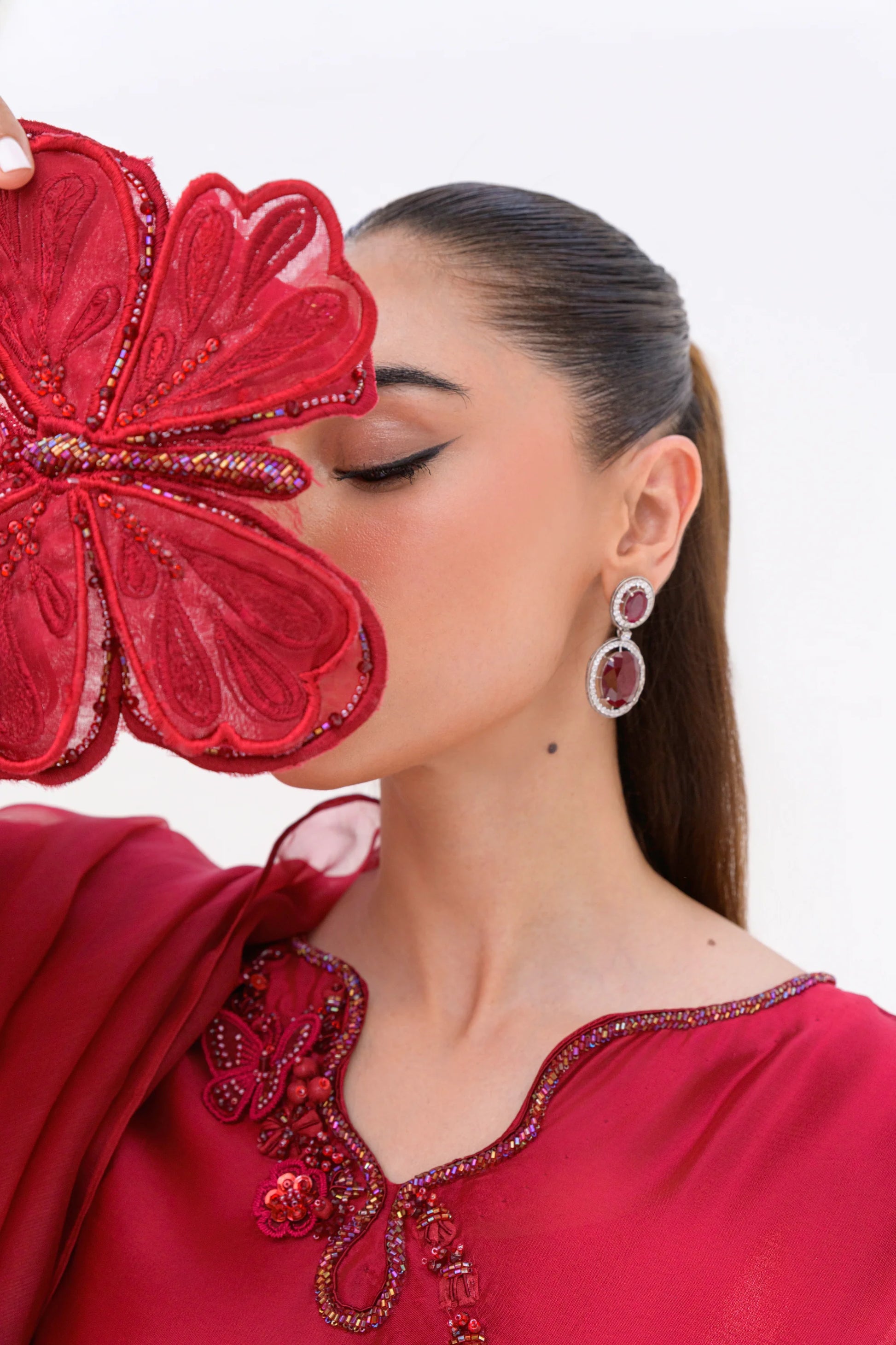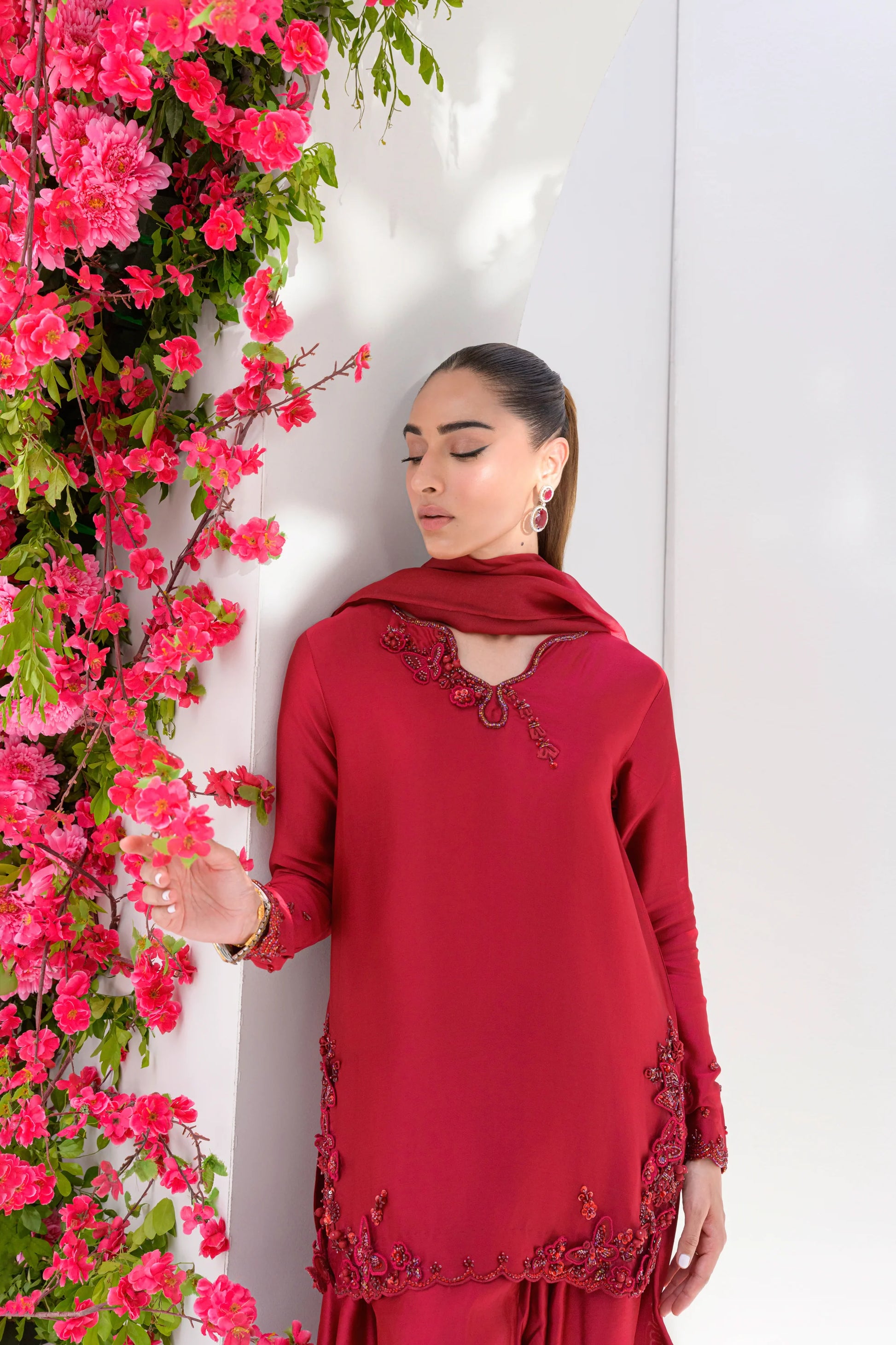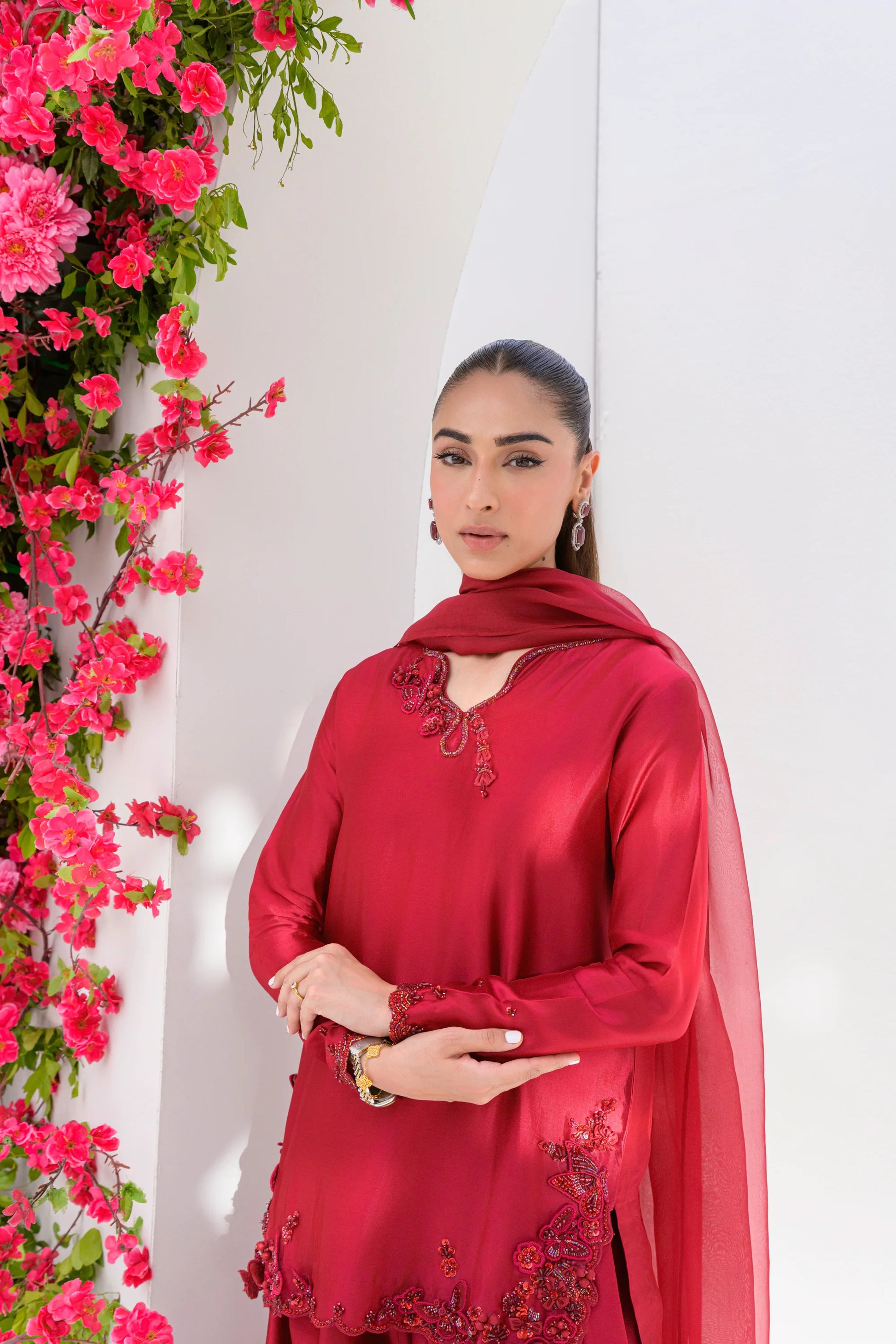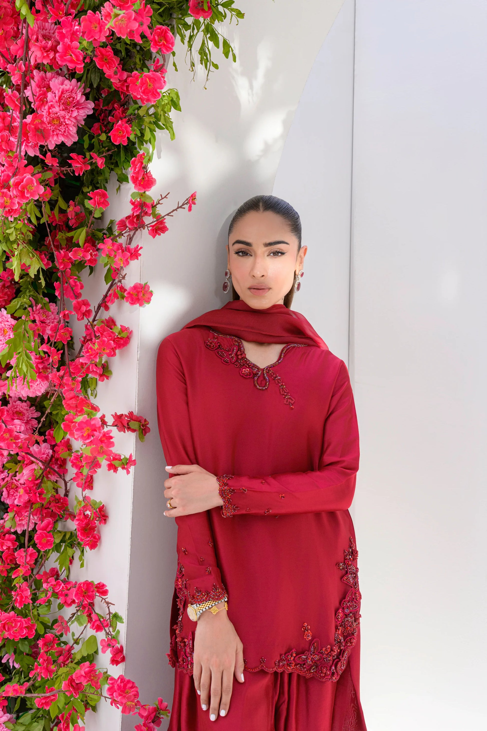 Red Velvet ensemble features a short shirt paired with a classic farshi shalwar. Adorned with intricate same colour maroon embellishments and embossed butterfly motifs, the outfit exudes charm and sophistication. The dupatta, crafted from delicate pure kattan organza, is edged with oversized 3D butterflies for a statement finish. Made from premium sheesha silk, this ensemble perfectly blends tradition with contemporary elegance.