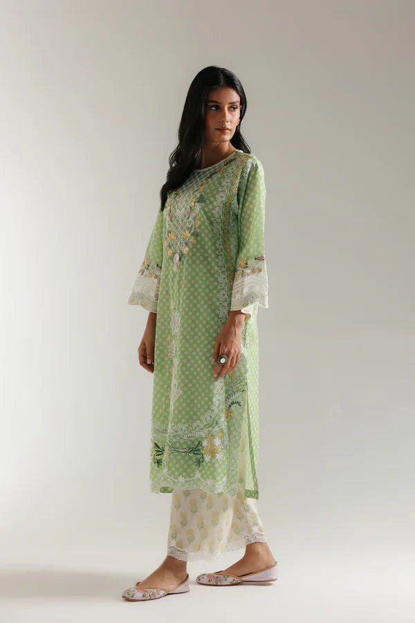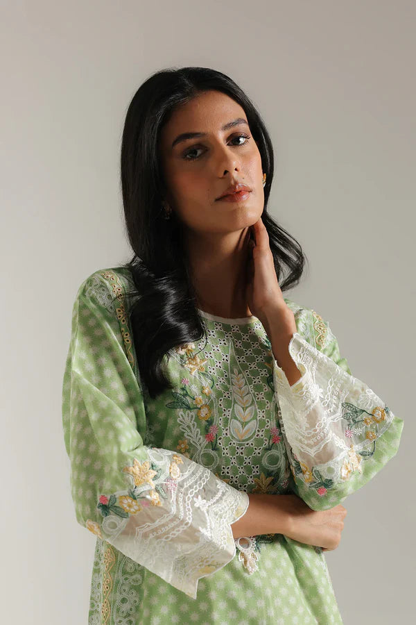 Immerse yourself in the fresh elegance of our Garden Whisper outfit. This enchanting ensemble features a straight-cut kurta in a soothing light sage green, subtly adorned with delicate white polka dots that provide a playful texture. The kurta is exquisitely embellished with intricate floral embroidery in soft shades of white, cream, and hints of pastel yellow and pink, showcasing a harmonious blend of traditional motifs and modern aesthetics. Paired with comfortable culottes in a complementary off-white, adorned with subtle floral prints, this set offers a graceful and sophisticated silhouette, ideal for spring gatherings, daytime events, or a refined casual look.