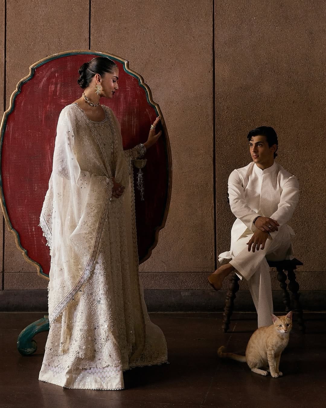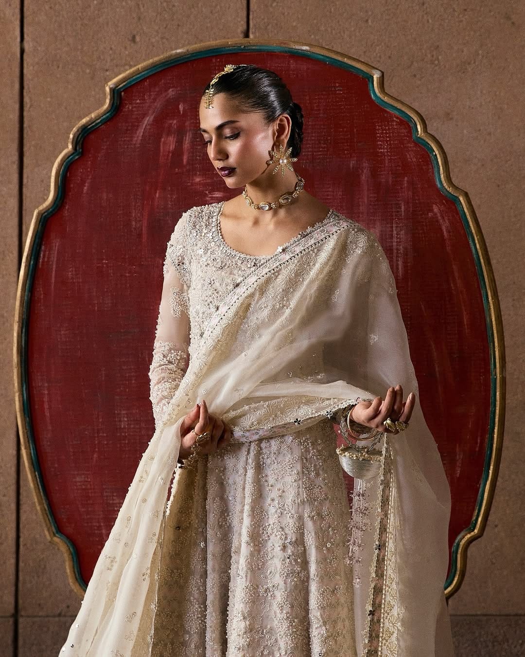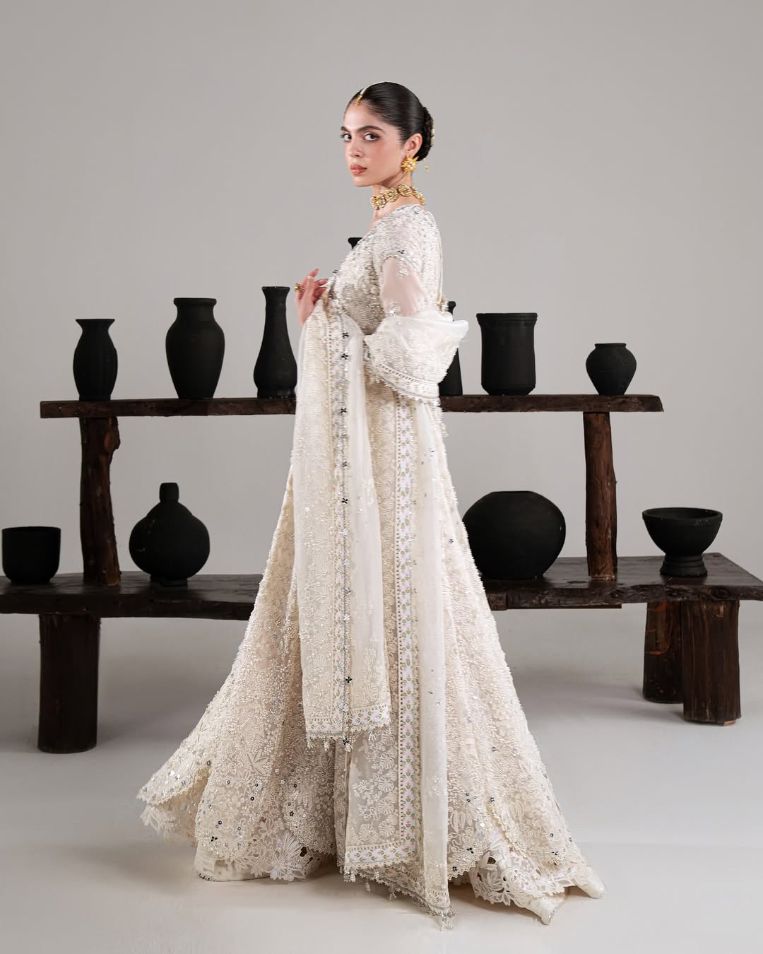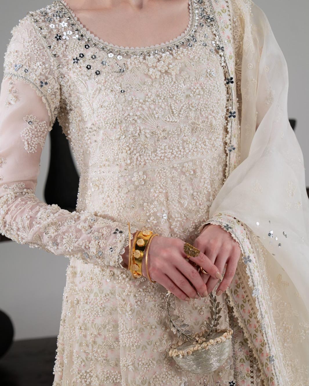 Zahrell Stitched-(4pc)- A vision in white, this four-piece organza pishwaas embodies timeless elegance. Featuring a scoop neckline, layered cap sleeves, and delicate self-embroidery with beads, mirrors, and pearls, it is layered over a printed slip with cutwork detailing. Paired with floral grip silk printed sharara pants and a matching organza dupatta finished with borders, sequins, pearls, and mirror tassels, the ensemble exudes ethereal